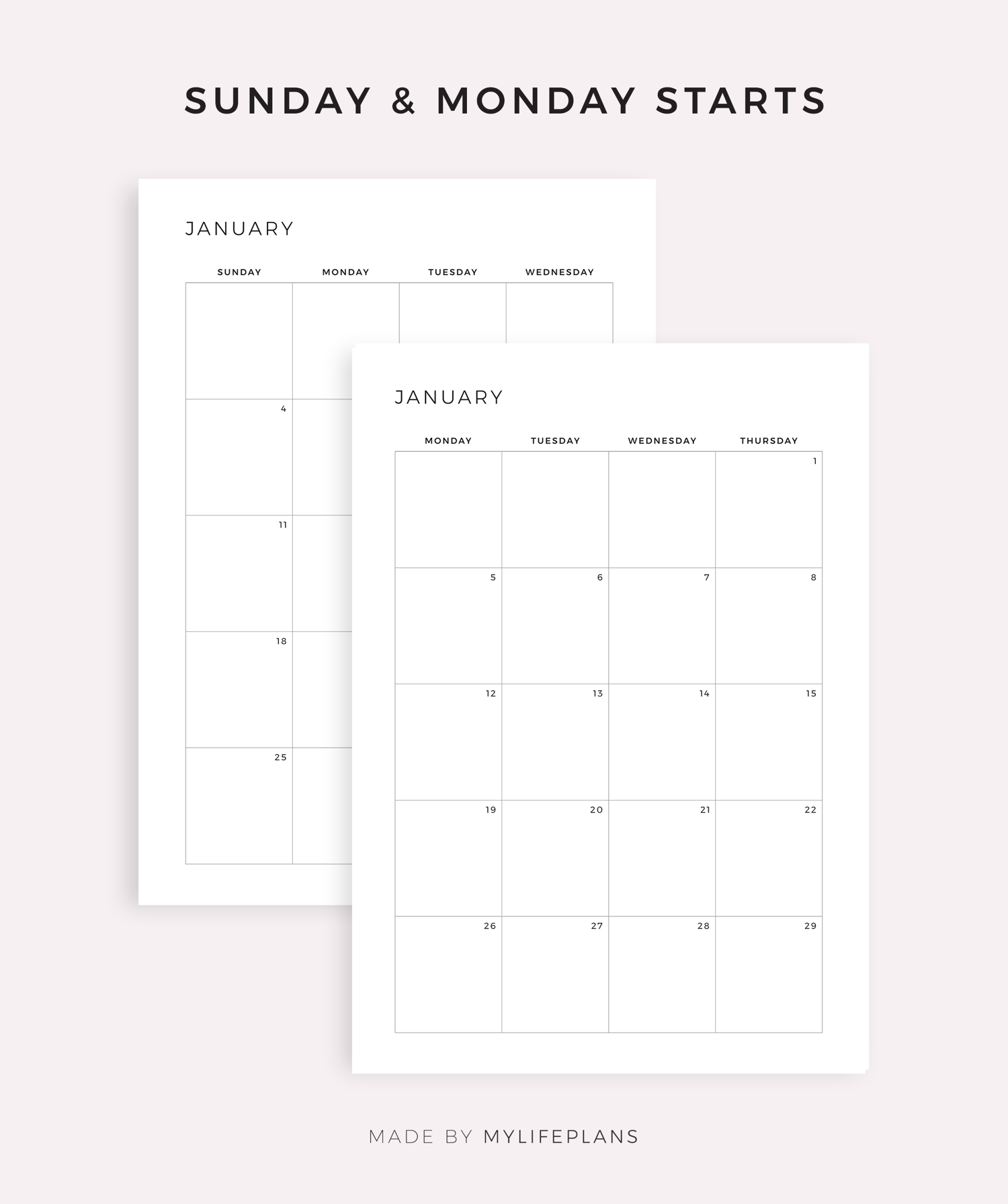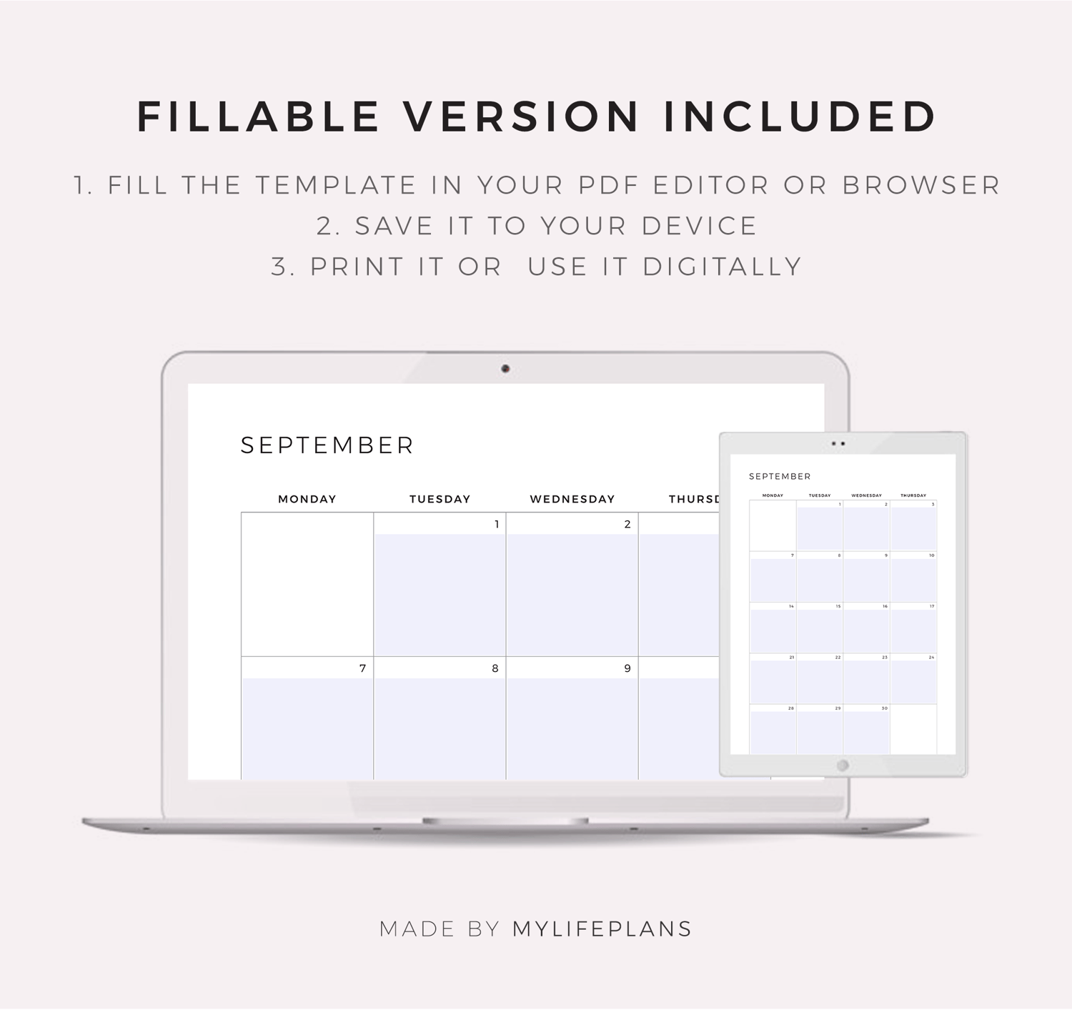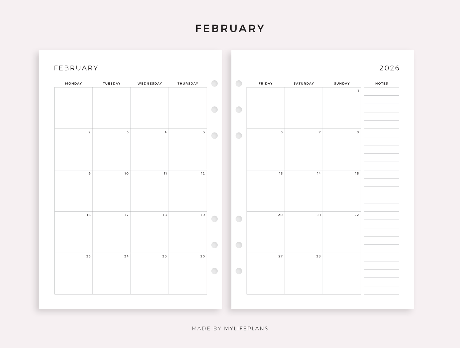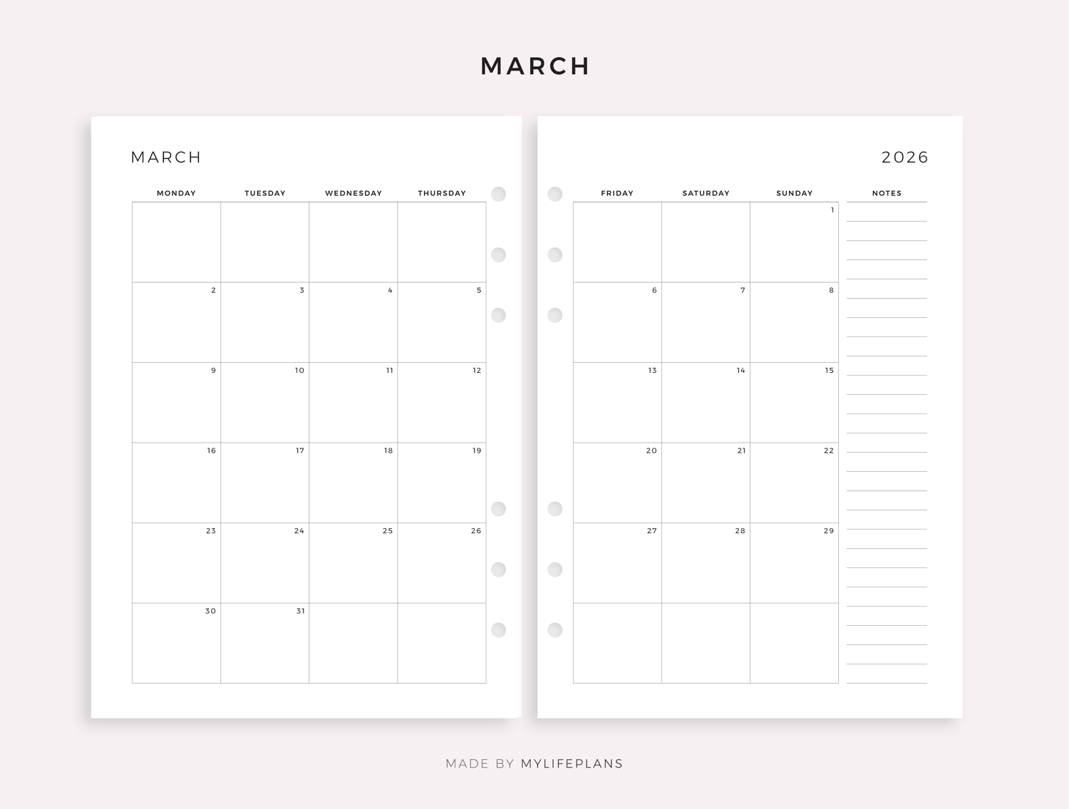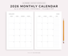 2026 Monthly Calendar on Two Pages with Notes, Printable & Fillable, A4/Letter Size