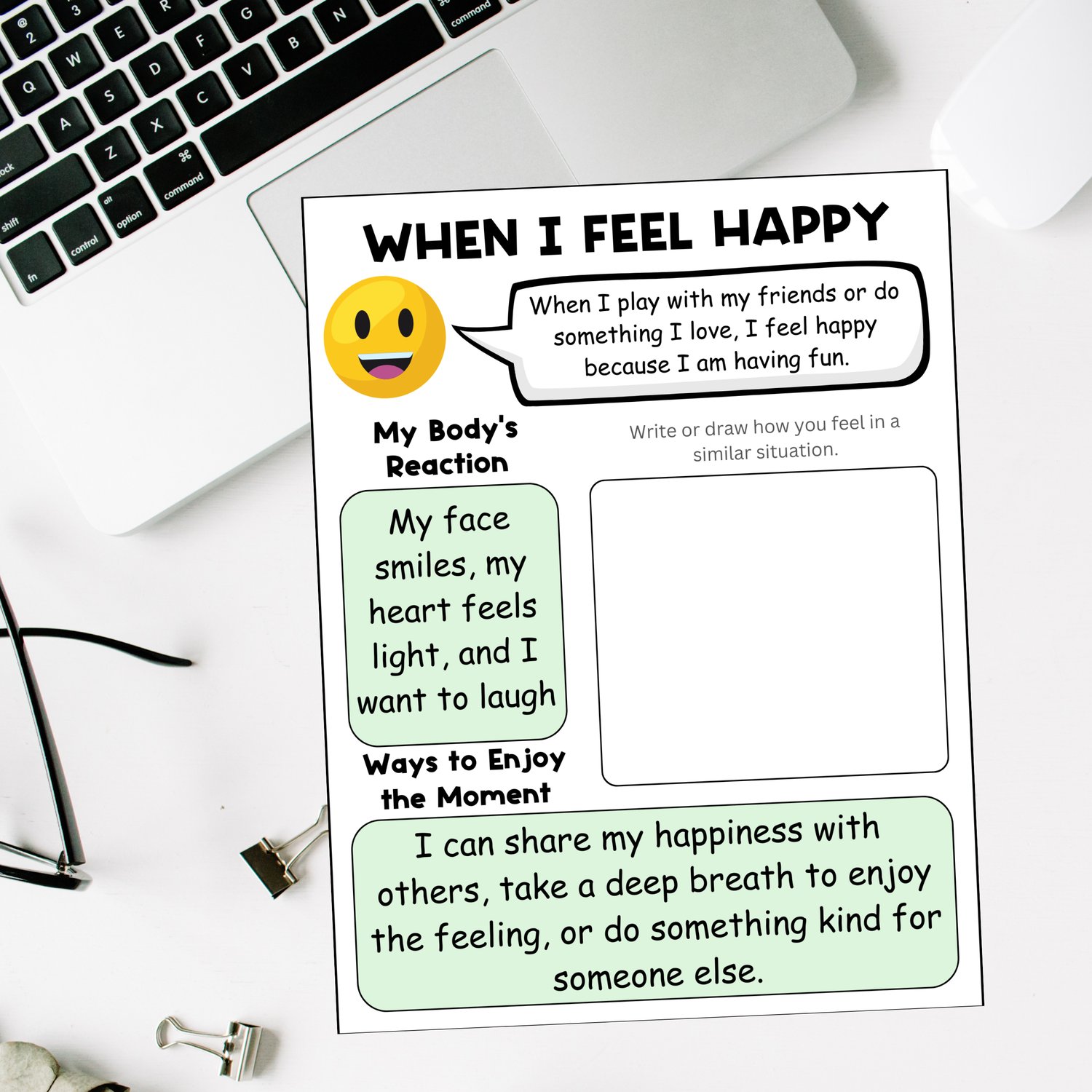 - Emotion Scenarios: Explore five common emotions with real-life situations, spaces for reflection, and helpful coping techniques.
