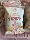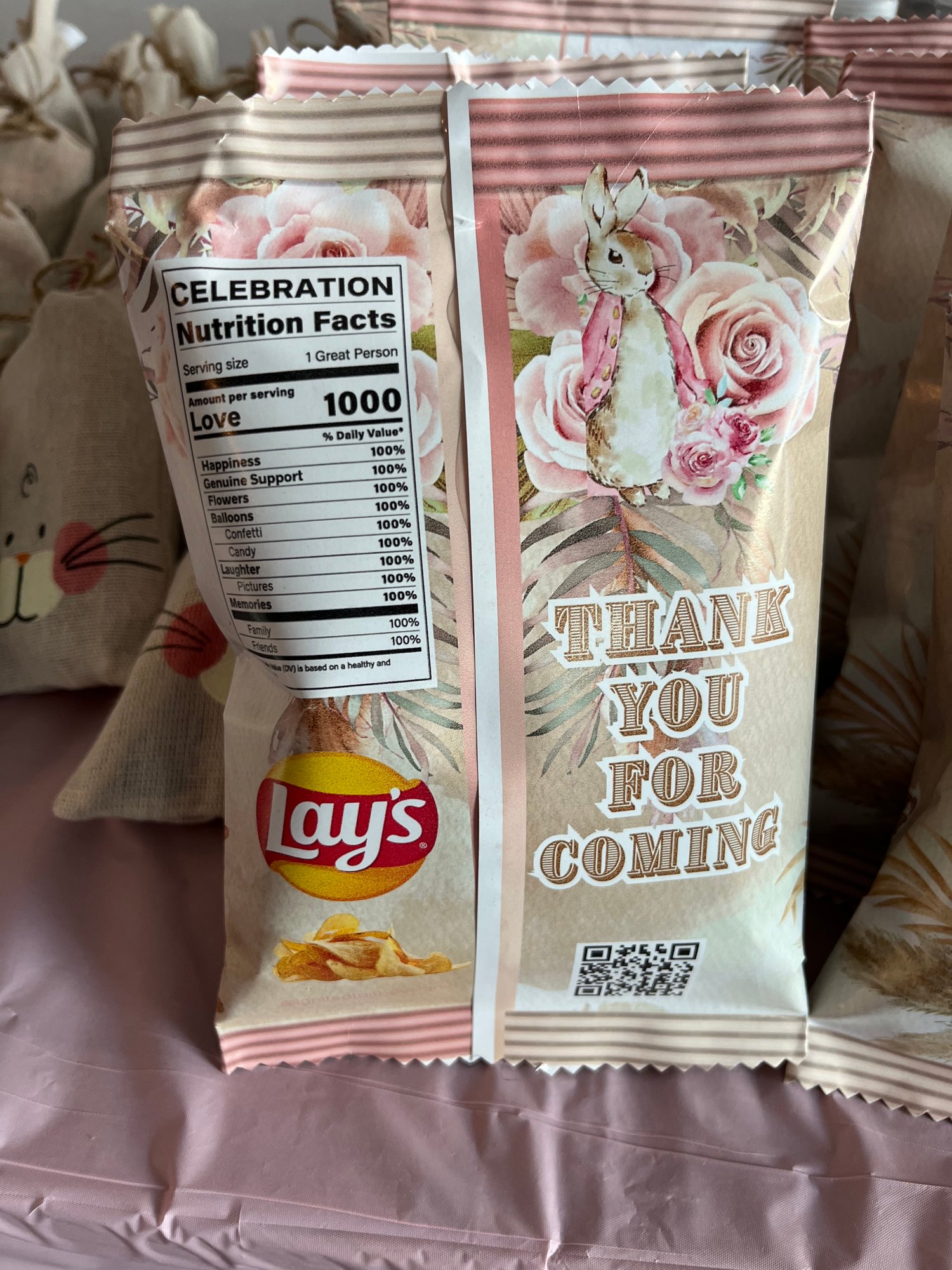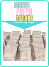 Spruce up your party or any special occasion with customized chip bags. Choose your own theme and colors or let our designers freestyle something for you! Standard chip bags are plain Lays potato chips. Other chips available upon request. Subject to availability. ***Hard to get items may require an additional fee!! Standard layout includes theme, nutrition facts, and thank you note! Each order comes with a dozen ( 12 ) bags.