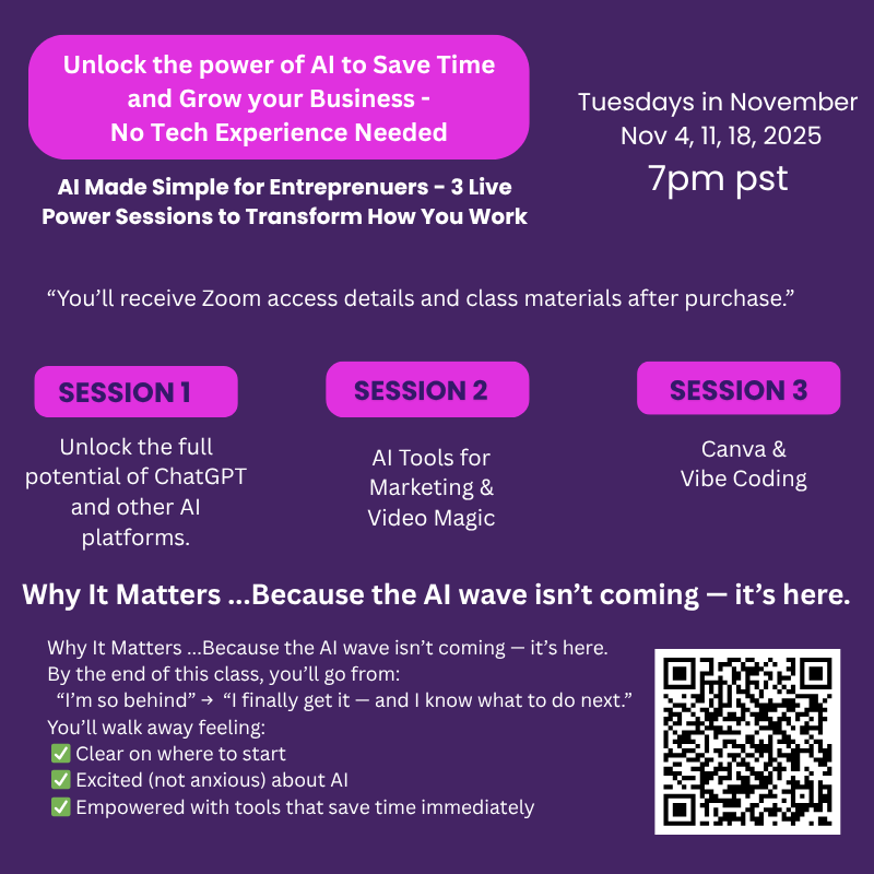 You get 3 sessions for only $99.00. After your purchase you will receive the zoom information with the details of the class. In the meantime, make sure to get your free or paid account of Chat Gpt here at https://chatgpt.com/. Feel free to reach out if you have any questions or concerns.