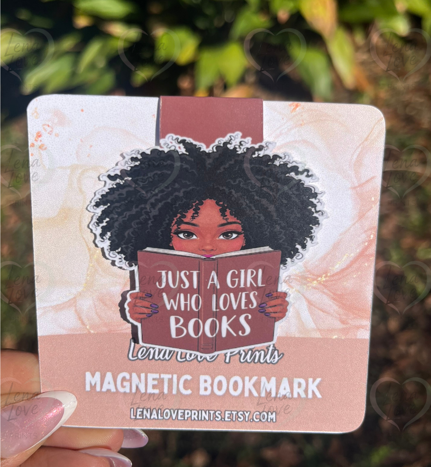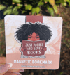 Celebrate the beauty, confidence, and intelligence of Black women with this stylish magnetic bookmark featuring original artwork and the quote “Just a Girl Who Loves Books.” Made with strong magnets and durable cardstock, it securely clips to your page without slipping or damaging your book.