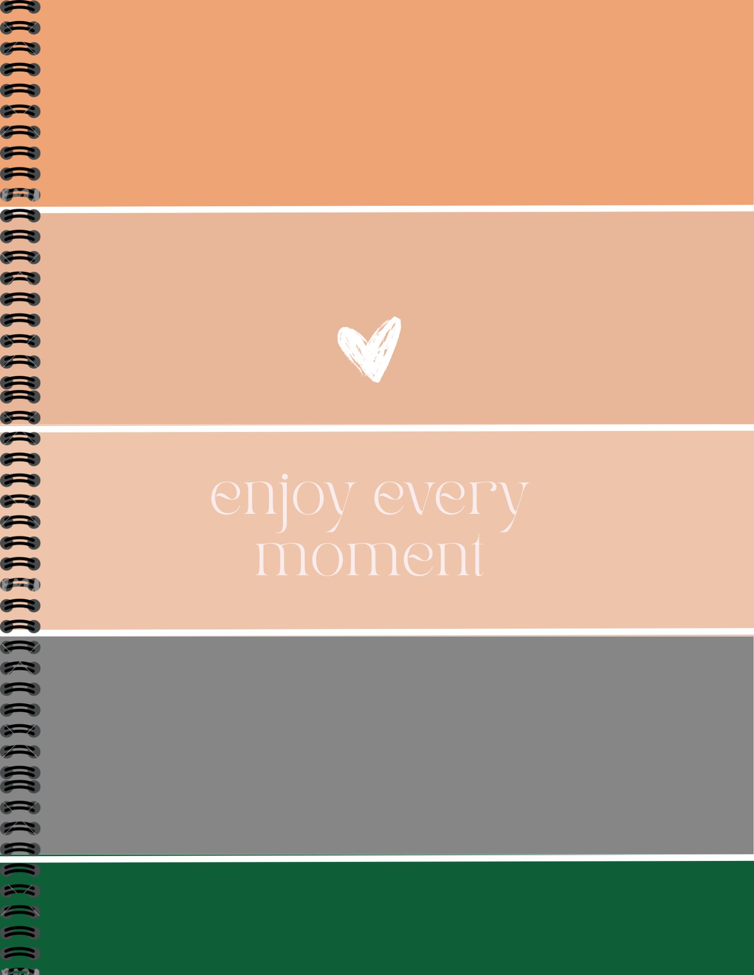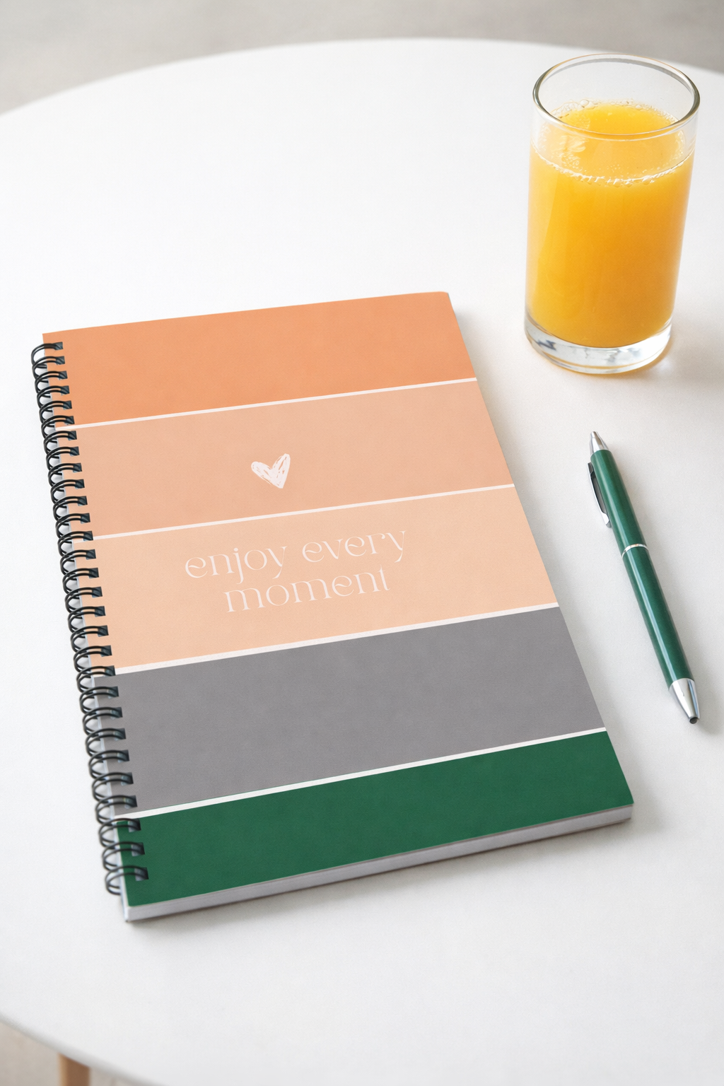 Add a touch of calm and inspiration to your daily routine with this beautifully designed spiral notebook. Featuring soft, modern color bands and the uplifting phrase “enjoy every moment”, this notebook is perfect for journaling, note taking, planning, or creative writing.
