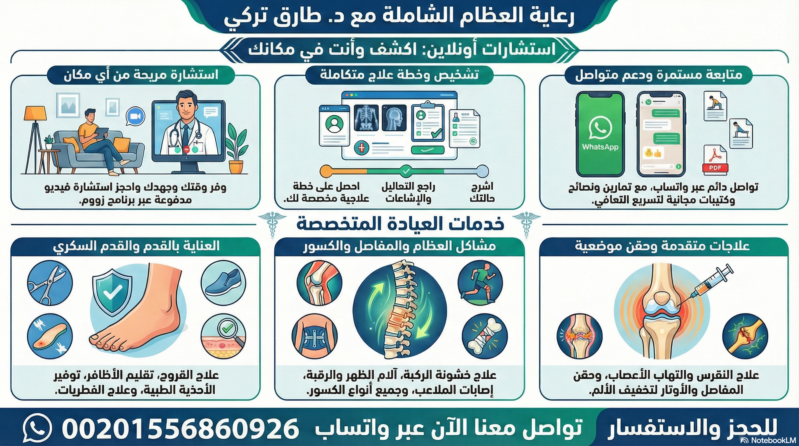 👌 لو حابب تستشير الدكتور طارق تركى استشارى جراحه العظام والقدم السكرى ومش قادر تيجى العياده عملنالك خدمه استشارات اونلاين مدفوعه مع الدكتور على برنامج زووم يعنى ممكن تكشف وتستشير الدكتور وانت فى مكانك وهتستفاد كتير.