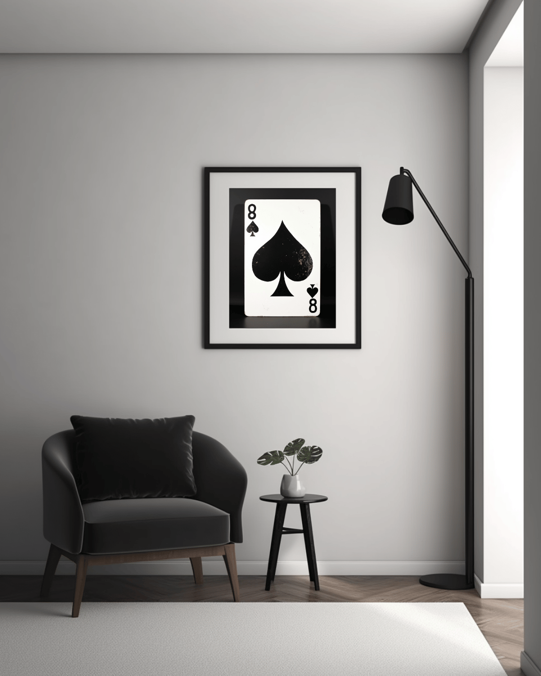 Bring timeless style to your space with this bold, vintage-inspired 8 of Spades art print. Featuring a distressed black-and-white playing card design, this piece adds a touch of retro edge to any room. Whether you're styling a game room, man cave, bar area, or eclectic gallery wall, this graphic artwork makes a striking visual statement.