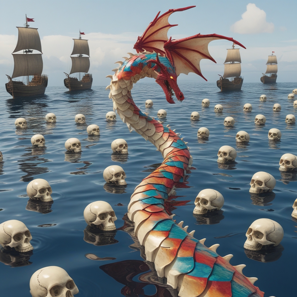A striped dragon’s scales transition into bone petals while acrylic tendrils weave between ships at sea. Each stripe edge becomes a reflective boundary where the heroine and skulls reappear in diminishing alignment.