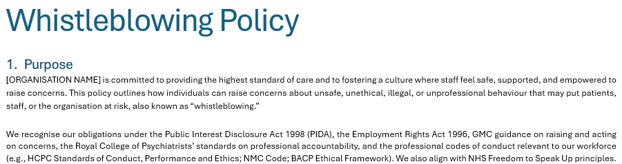 This is a template Whistleblowing Policy designed to cover most small autism/ADHD assessment and ADHD medication management services. It is designed to be compliant with NHS requirements.