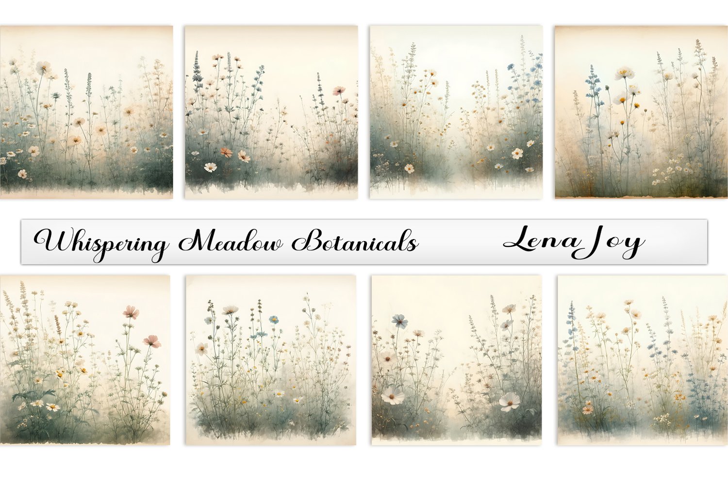 Keywords—wildflowers, dusty, misty, whispering meadow, meadow, botanicals, peaceful, calm, papers, backgrounds, yellow, green, blue, cream, purple, delicate flowers, whispy