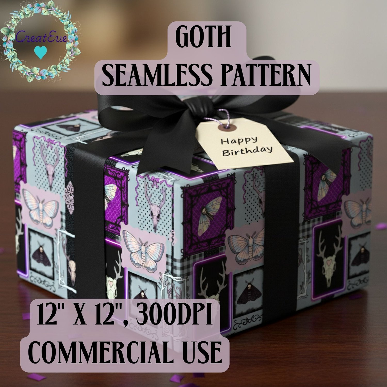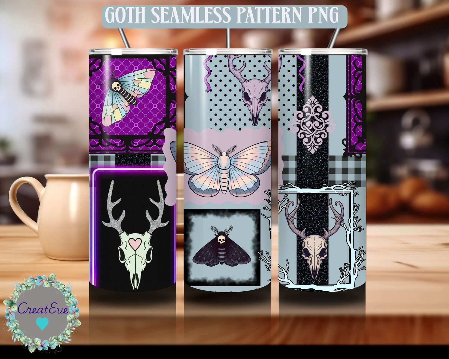 Goth Moth & Antler Deer Skull Pastel Seamless Pattern, Commercial Use, 300dpi, 12" x 12"