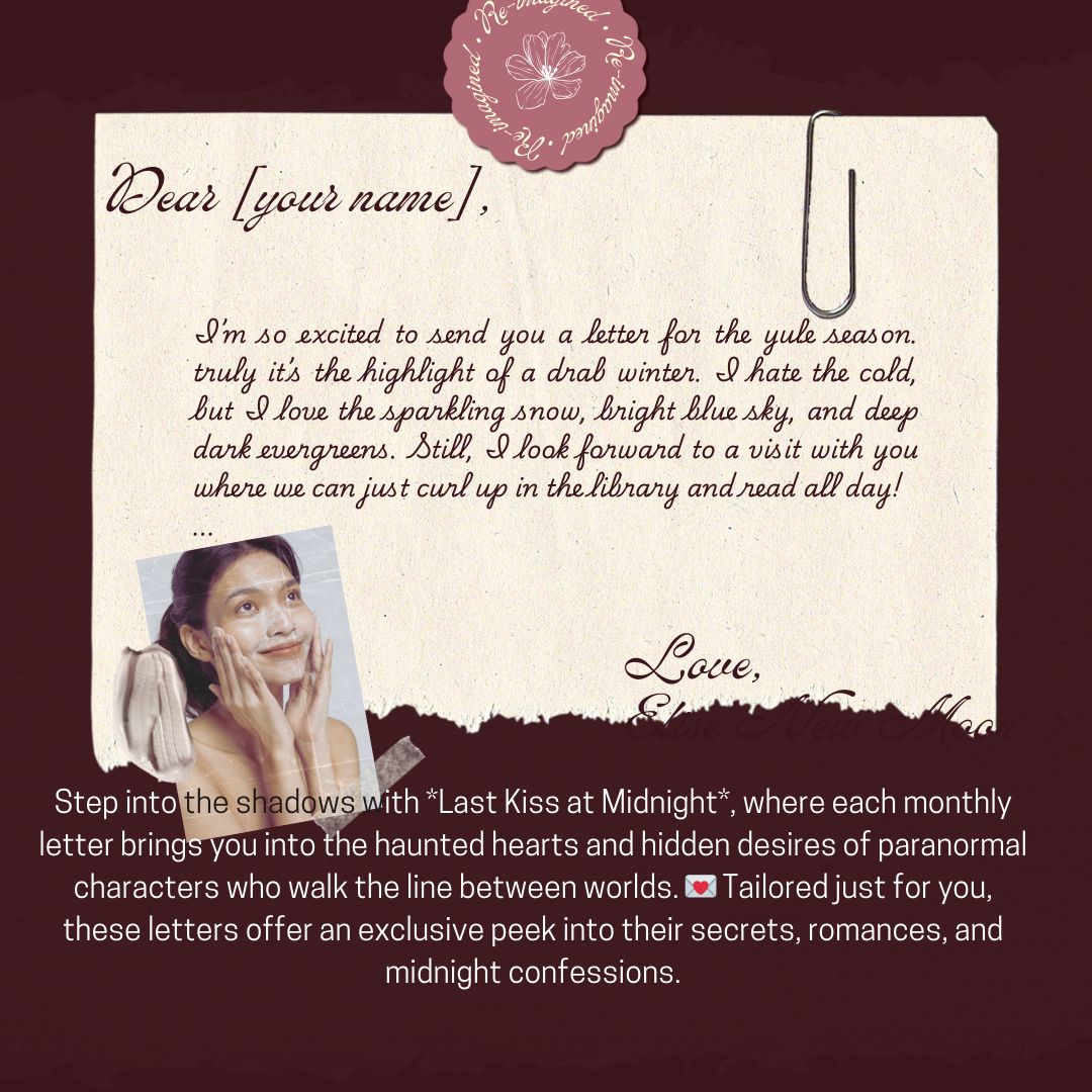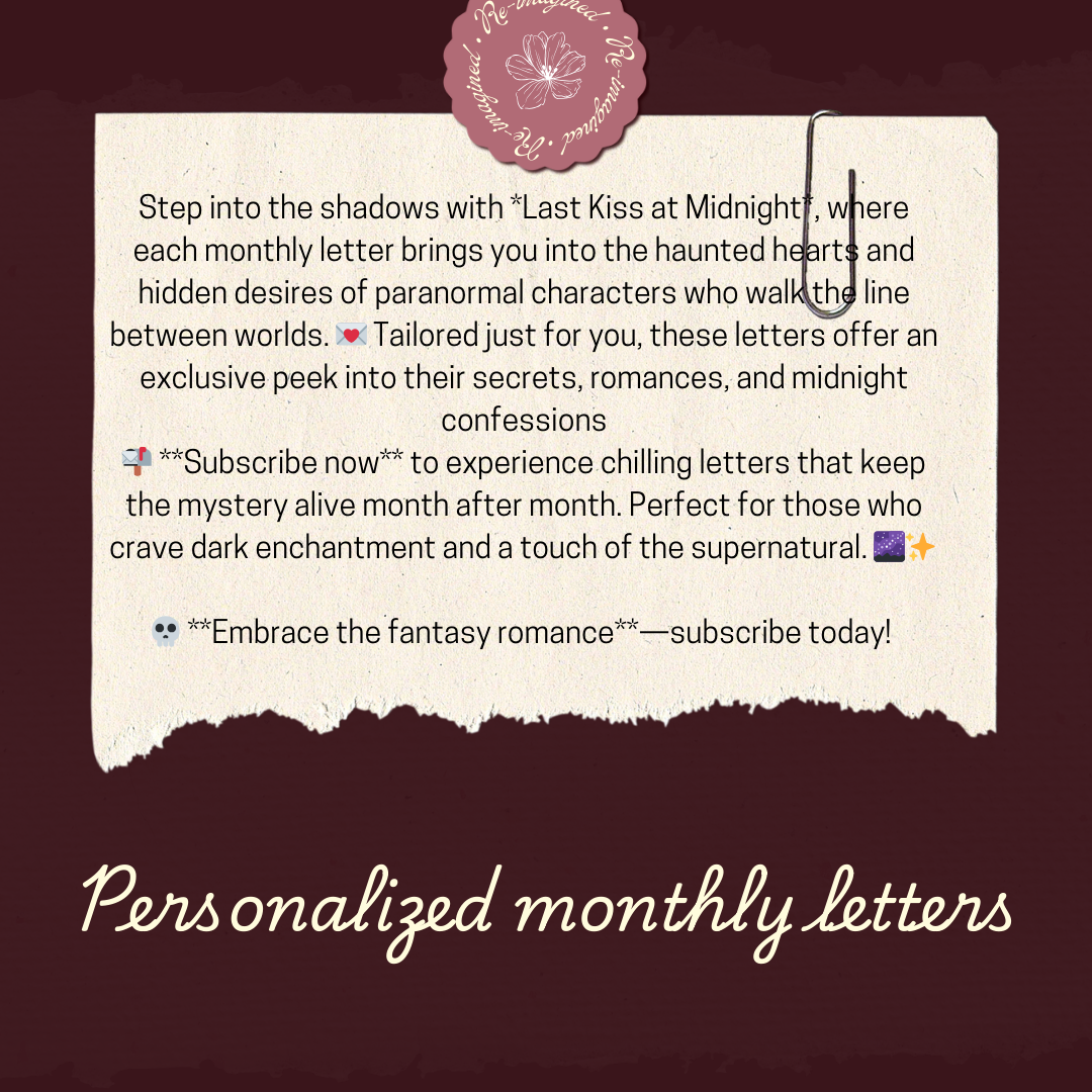 Step into the shadows with *Last Kiss at Midnight*, where each monthly letter brings you into the haunted hearts and hidden desires of paranormal characters who walk the line between worlds. ๐๐ Tailored just for you, these letters offer an exclusive peek into their secrets, romances, and midnight confessions.