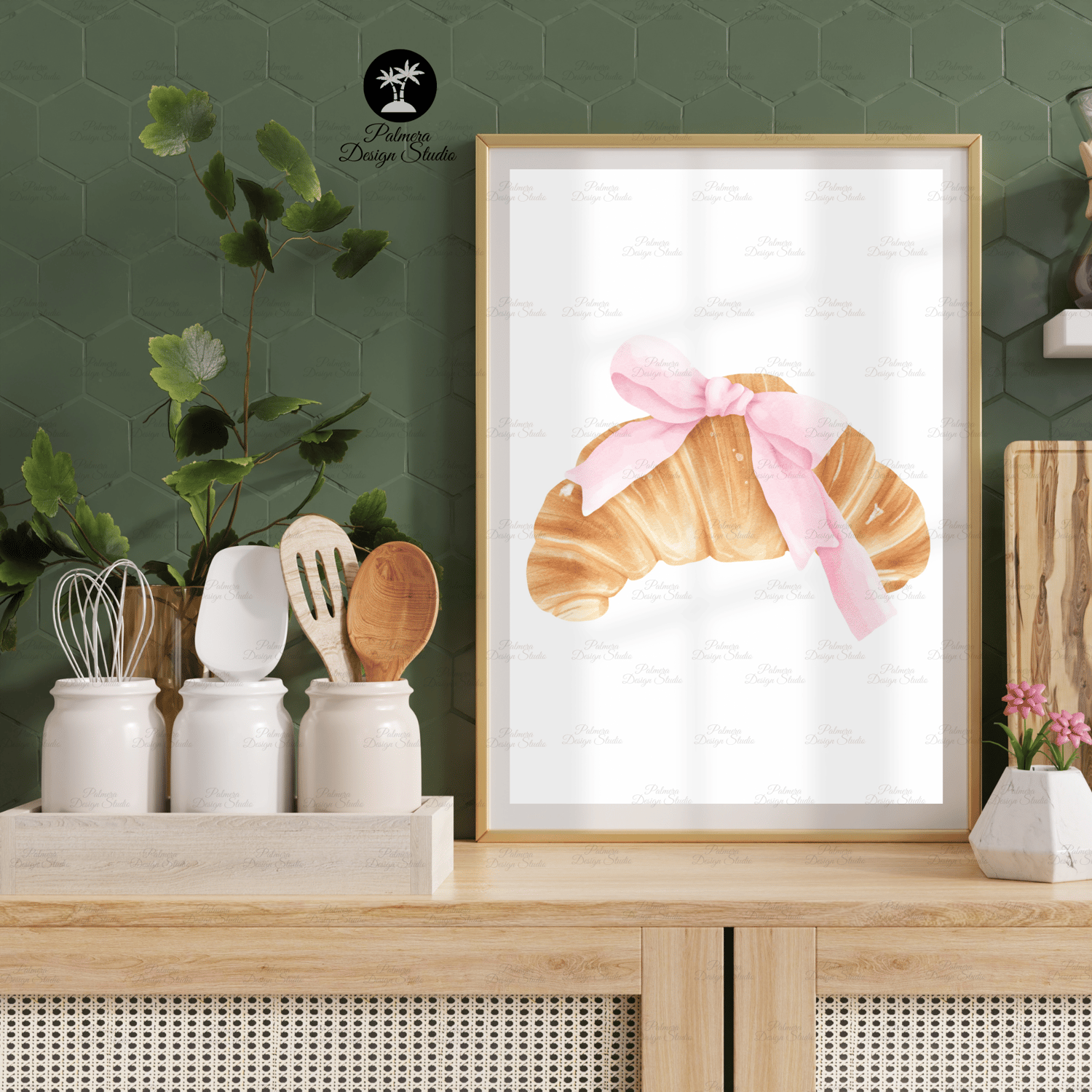 Coquette Breakfast Wall Art Set – Croissant, Coffee & Berries Prints – Parisian Feminine Kitchen Decor – Digital Download