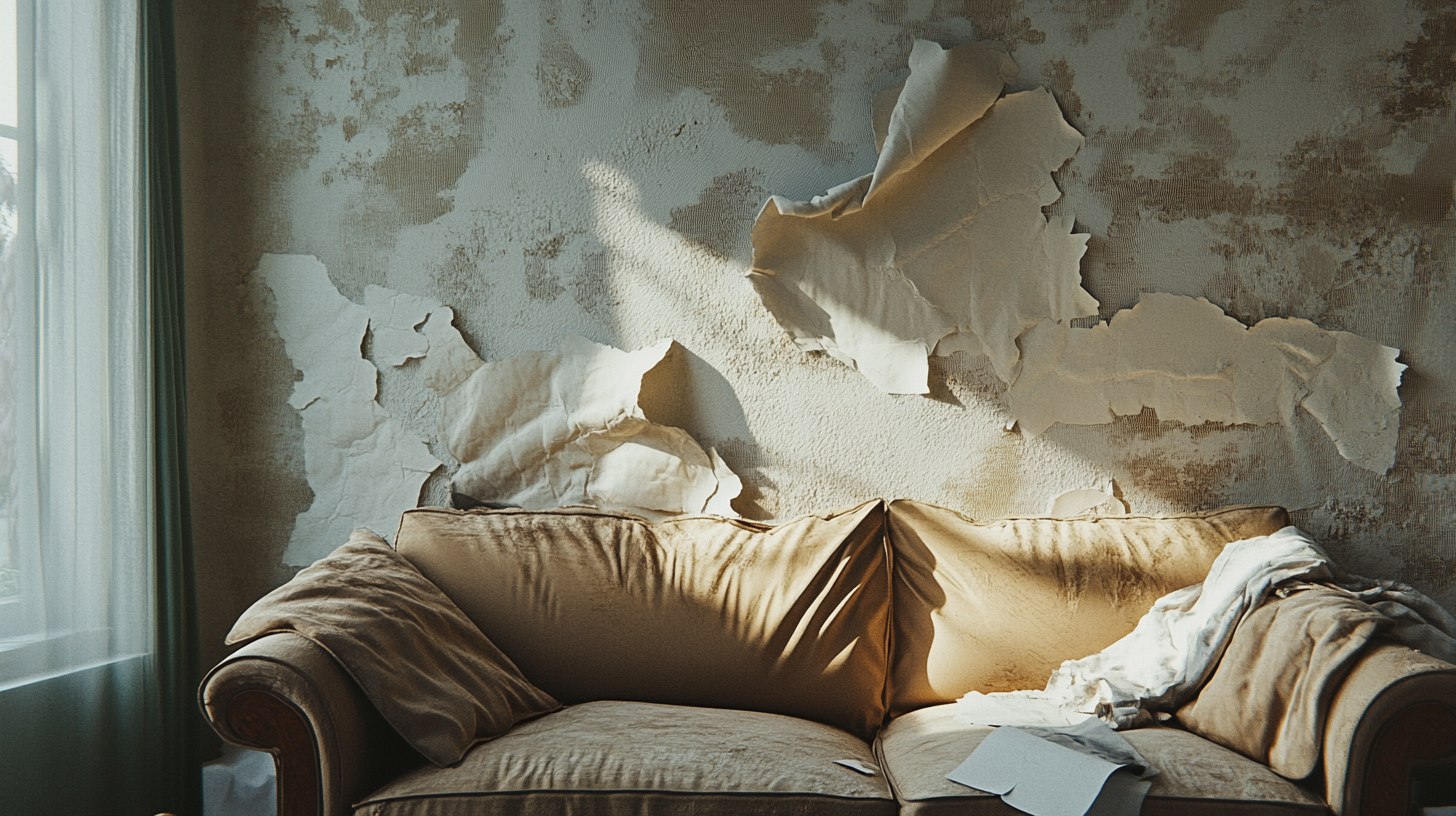 Generate ultra-realistic, wide-shot images of home renovation disasters with this prompt. Perfect for showcasing peel-and-stick wallpaper gone wrong, capturing curling edges, misaligned seams, and textured wall surfaces in stunning 8K detail. Ideal for interior design blogs, DIY content, or social media storytelling that conveys frustration, disappointment, and the human side of home projects. Keywords: home renovation fail, hyper-realistic interior, peeled wallpaper, documentary photography, 8K textures.