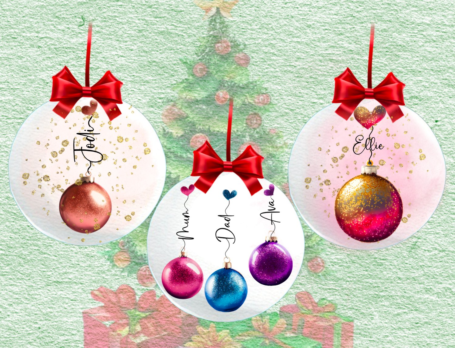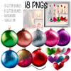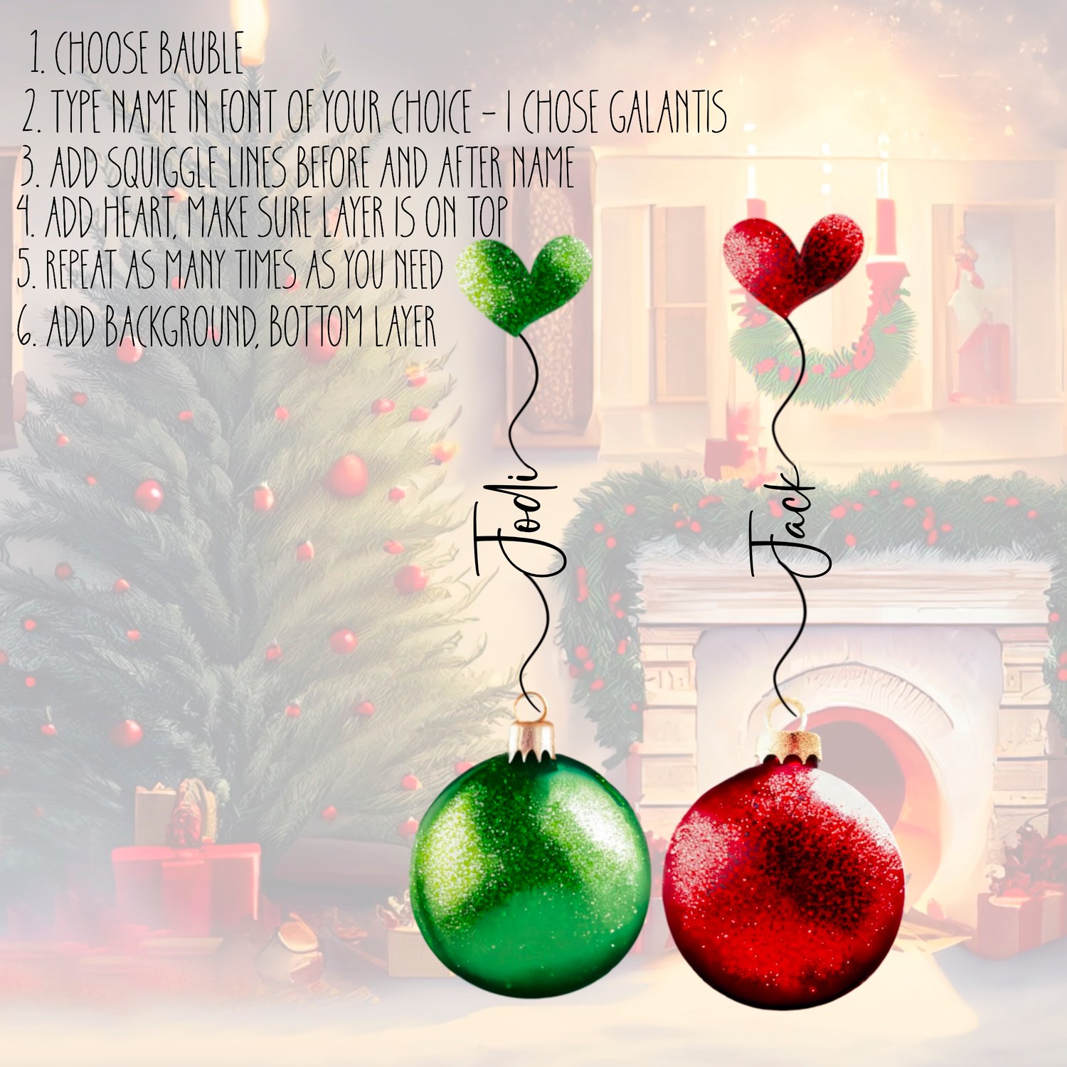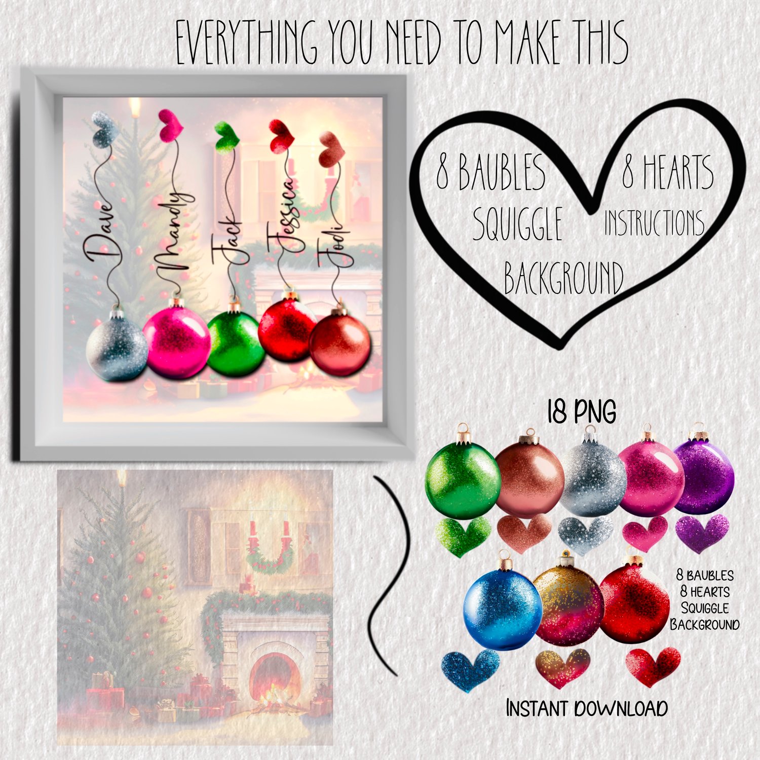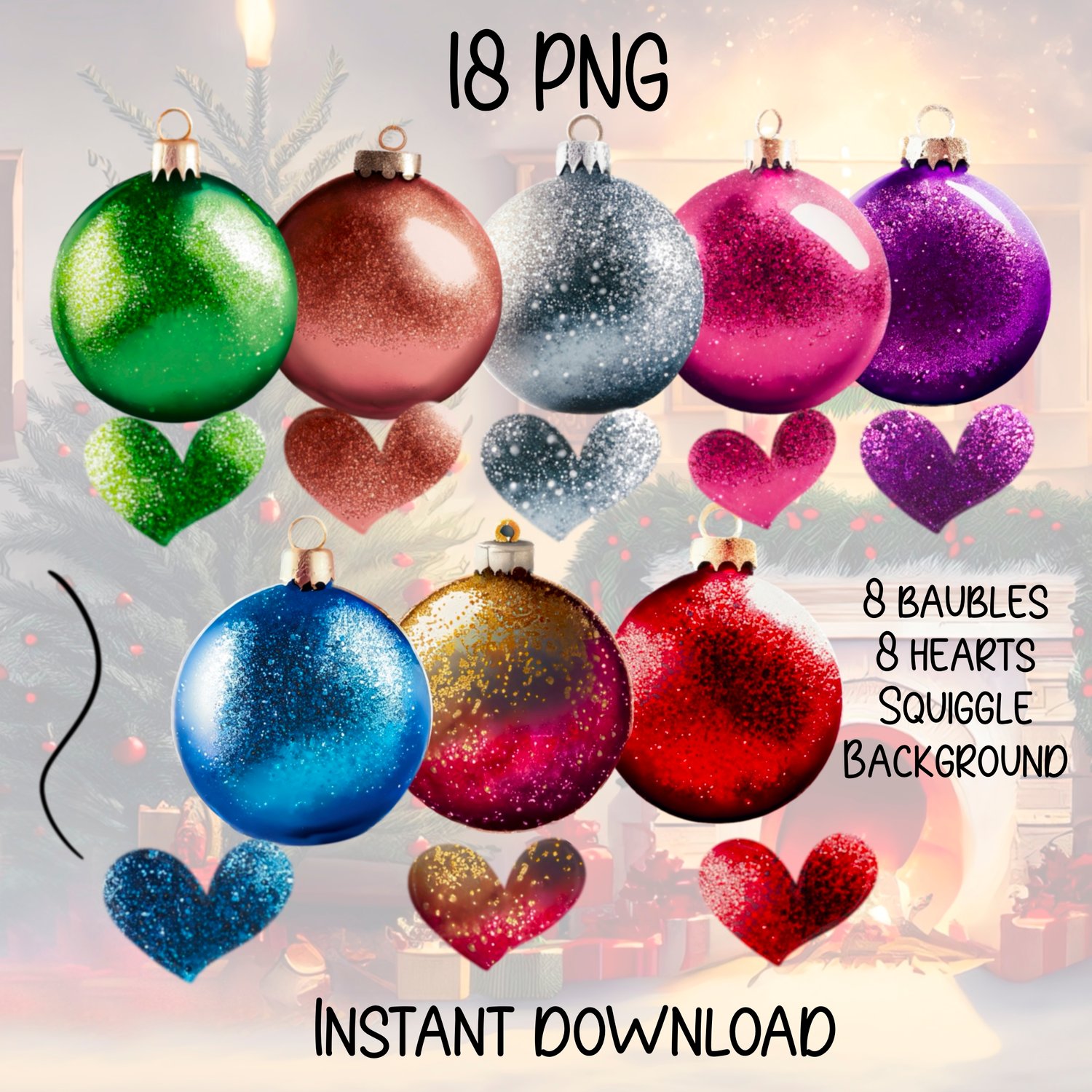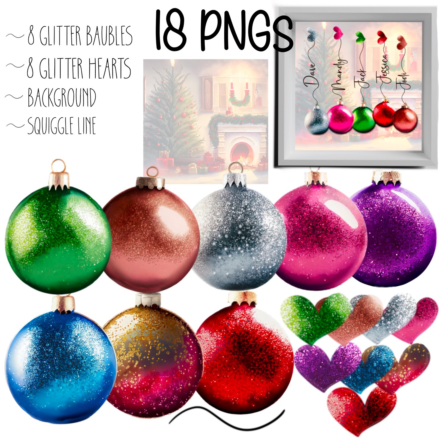 All elements to create your own personalised Christmas gift. 8 glitter baubles/hearts, background, squiggle etc. 18 PNGs: