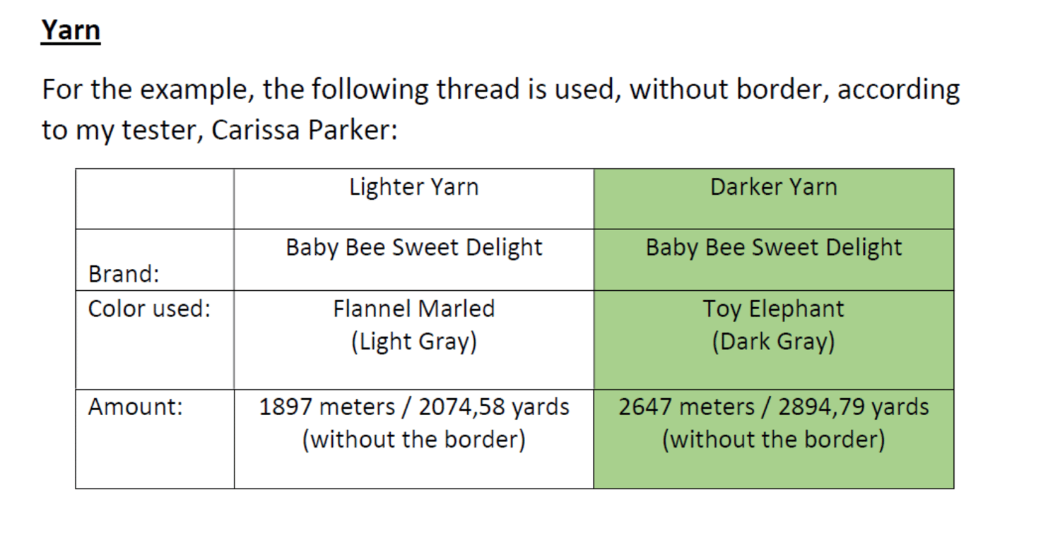 The amount of yarn used for this pattern by my tester without the border was: 1897 meters / 2074,58 yards (colour lighter, Flannel Marled) and 2647 meters / 2894,79 yards (colour darker, Toy Elephant)