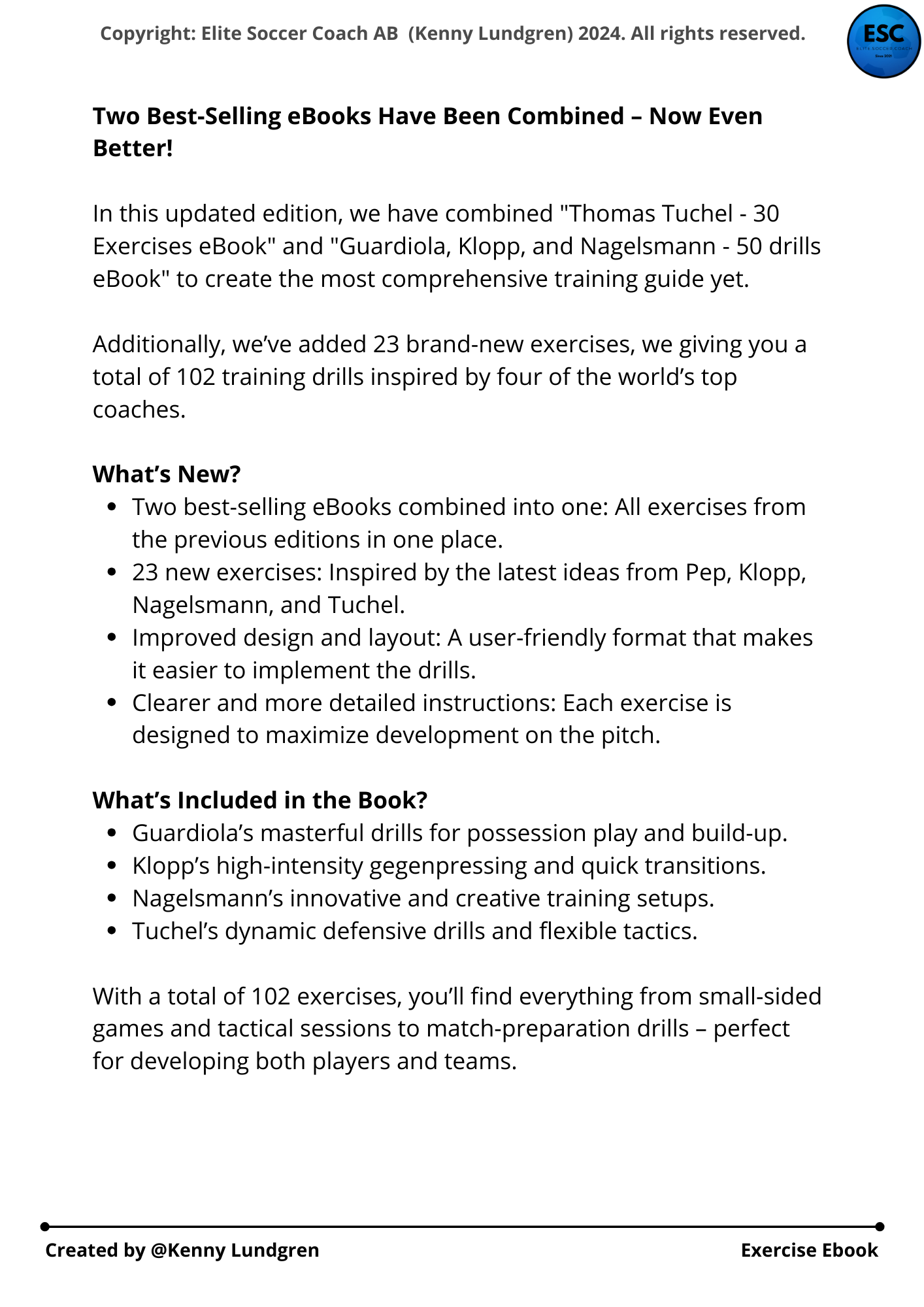 In this updated edition, we have combined "Thomas Tuchel - 30 Exercises eBook" and "Guardiola, Klopp, and Nagelsmann - 50 drills eBook" to create the most comprehensive training guide yet. Additionally, we’ve added 23 brand-new exercises, giving you a total of 102 training drills inspired by four of the world’s top coaches.