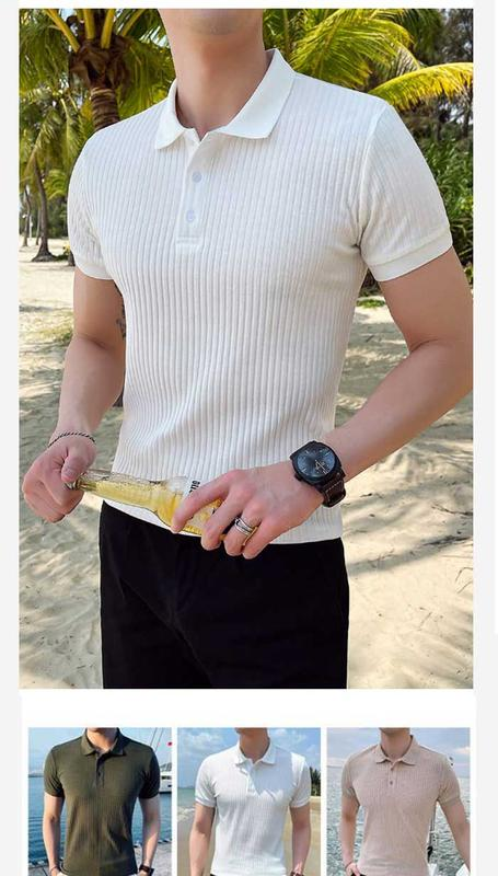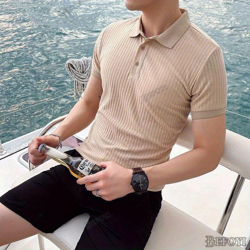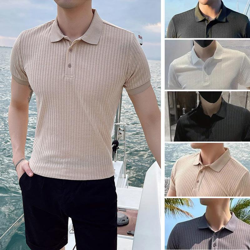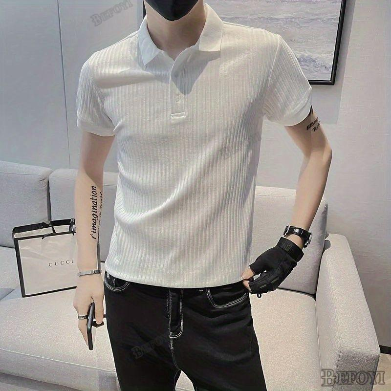 Men's Short Sleeve Polo Shirt, Trendy Solid Striped Knitted Summer Shirt, Ins Slim Fit, Casual Pattern, Korean Couple T-Shirt, Shirt ZYQ059