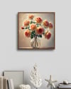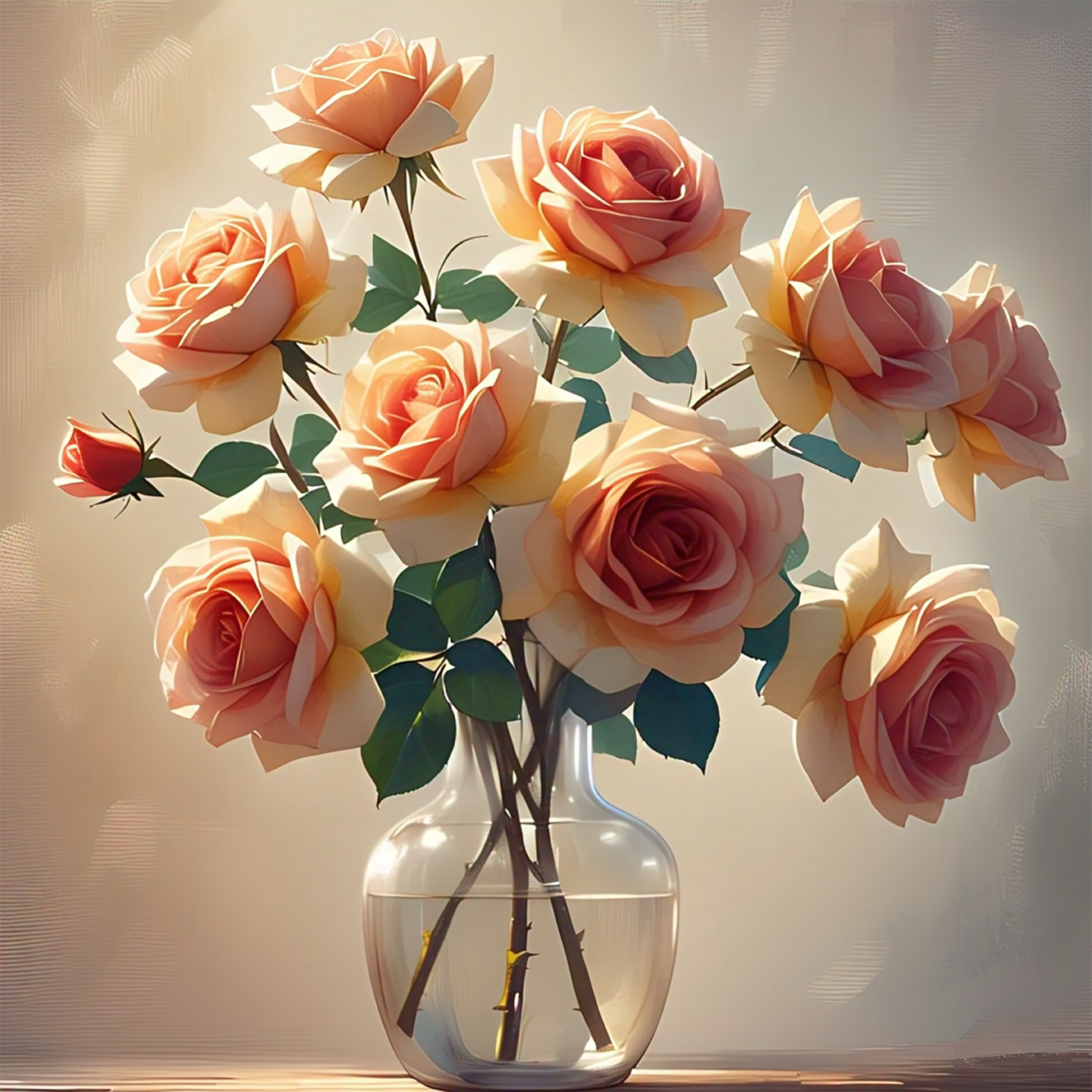 This painting shows a delicate bouquet of roses arranged in a clear glass vase. The petals carry soft shades of peach, cream, and blush, blending gently under a warm light. Each bloom opens gracefully, while a single bud hints at growth and continuity. The water in the vase reflects clarity and stillness, grounding the arrangement in simplicity. Subtle shadows and highlights give the flowers a gentle radiance, creating a calm and intimate atmosphere. The work emphasizes elegance, balance, and the quiet presence of beauty.