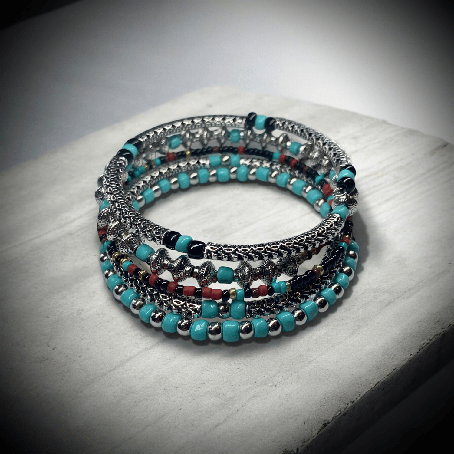 Elevate your everyday look with this layered boho bracelet set, featuring a beautiful mix of turquoise-tone beads, silver-tone accents, and intricate metal detailing. Designed to create an effortlessly stacked look, each strand brings its own texture and character-working together to deliver a bold yet balanced statement.