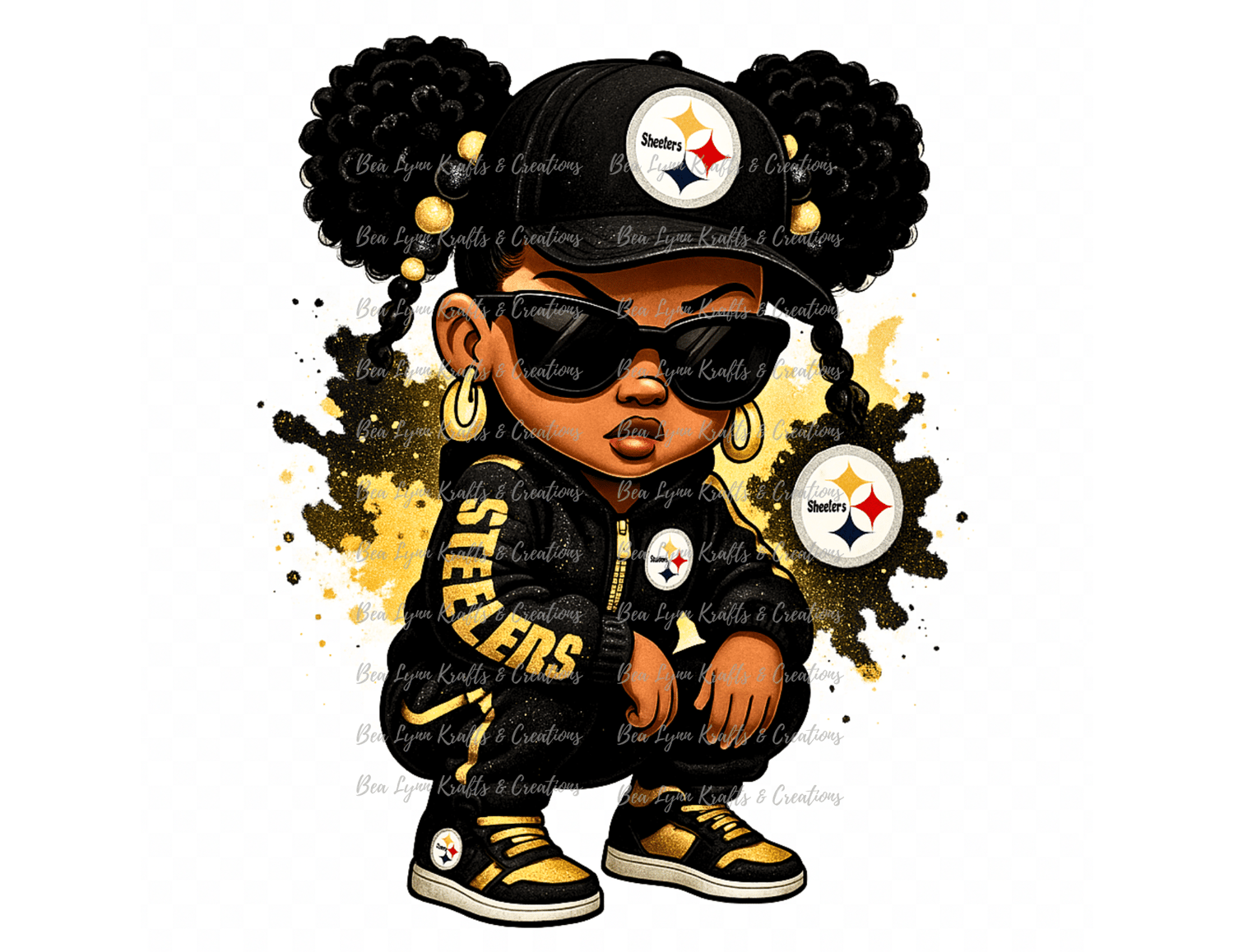 Bring serious swagger to your sports designs with this fierce Pittsburgh Steelers cartoon girl PNG! Styled head-to-toe in black and gold, this confident young fan rocks a Steelers tracksuit, gold hoop earrings, oversized sunglasses, and sporty sneakers—all set against a dynamic splatter backdrop. With a bold pose and undeniable game-day attitude, this image is a total win for your next design project.