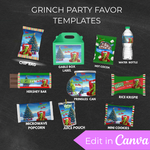 This collection includes templates for chip bags, juice pouches, mini cookies, Hershey bars, rice krispies, hot cocoa, gable boxes, water bottles, popcorn wrappers, Pringles cans, and more. Whether you’re hosting a Christmas party, school event, or selling custom favors for clients, these templates help you create high-end, cohesive favors in minutes.