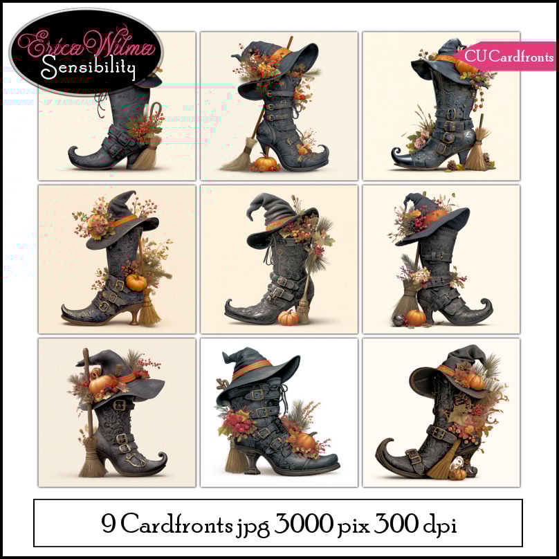 Add a touch of spooky elegance to your creative projects with this charming set of 9 Halloween-themed cardfronts. Each design features beautifully detailed witch boots, hats, pumpkins, and autumn florals — perfect for creating unique seasonal art, greeting cards, or digital projects.