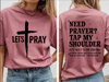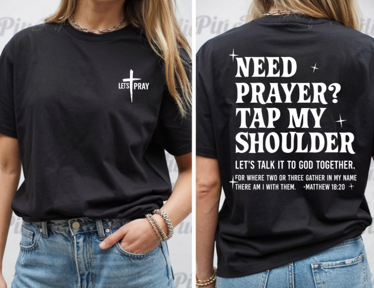 This inspiring faith-based design features the uplifting message "Need a Prayer - Tap My Shoulder - Let's Pray" perfect for creating Christian apparel and accessories. Share your faith and offer encouragement with this meaningful PNG graphic.