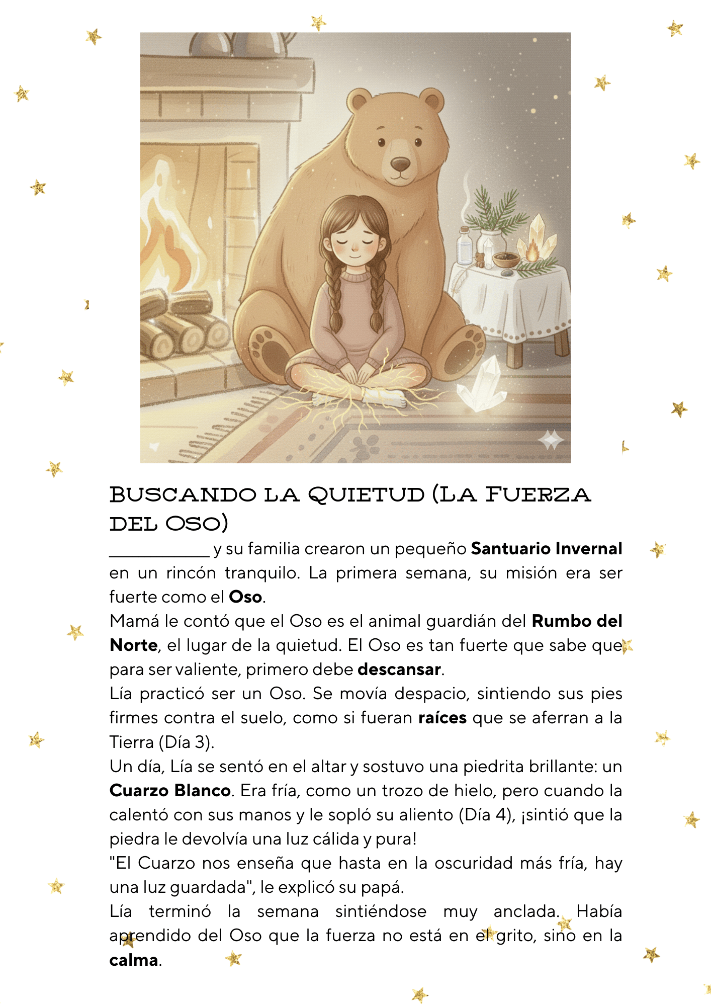 - Día 1-3 (Tierra y Sabiduría): Descubre la fuerza del Rumbo del Norte. Aprende del Oso Durmiente la poderosa lección del reposo. Enraiza a tu hijo en la Tierra para darle seguridad y firmeza interior.