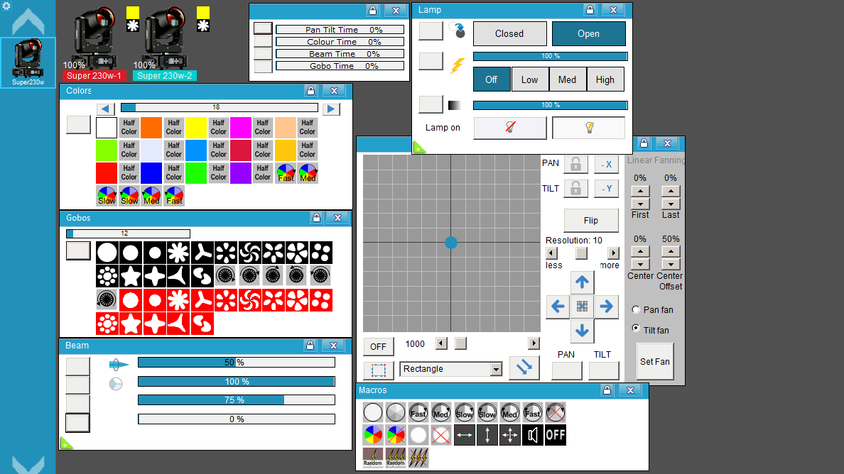 * Verifique, con un Fixture de pruebas (click), que coincidan estos canales: 10 Pan, 12 Tilt, 3 Dimmer, 2 Shutter/Strobo, 1 en el valor 109 = Color Verde.