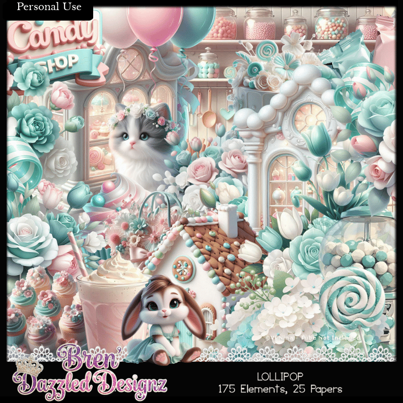 A cute little kit to match ViNina's tube by the same name Lollipop. There are 175 elements and 25 Papers, that are partially ai. With Light Teal, Light Pink and white elements and papers this kit is a must have.