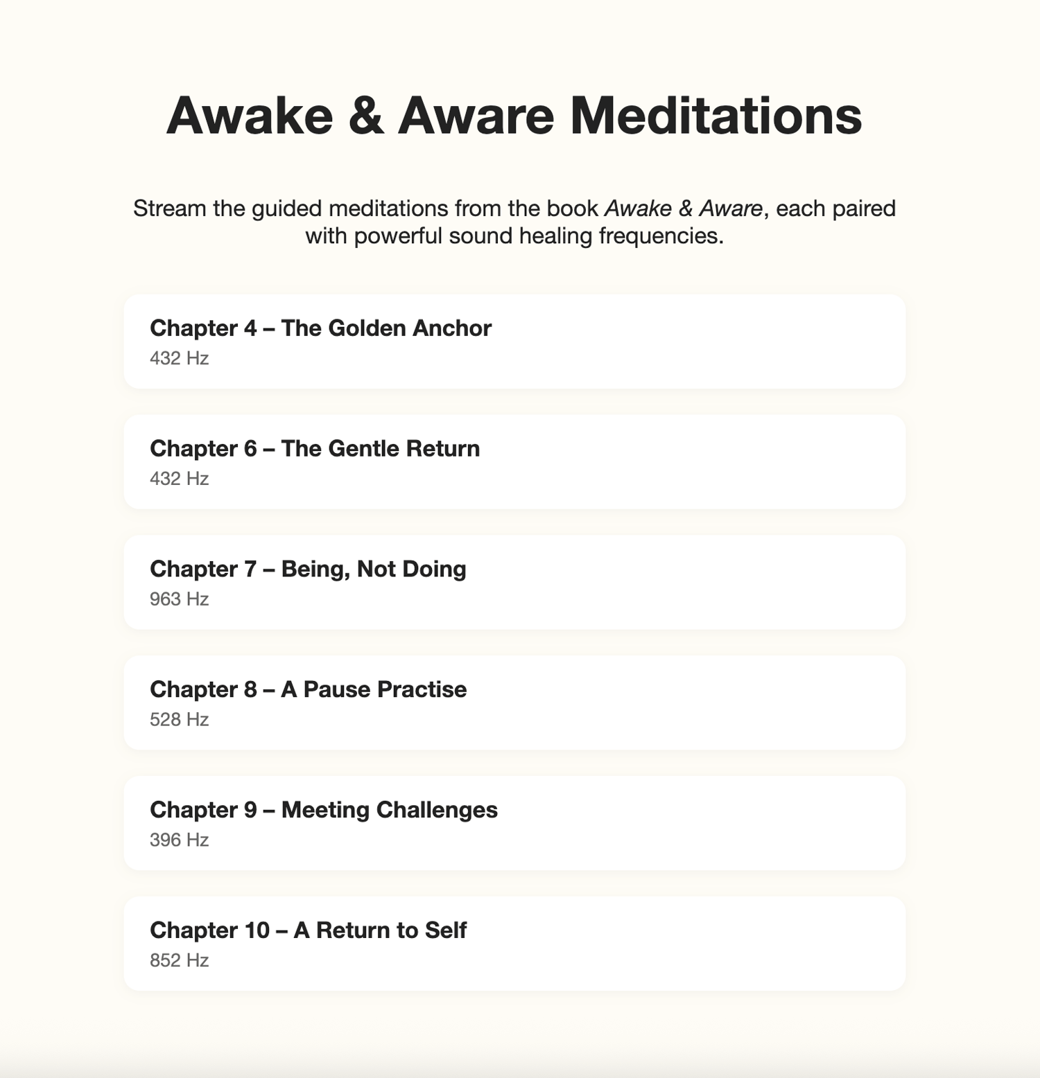Each meditation is paired with a sound healing frequency (including 432hz, 528hz, and 963hz) to support emotional clarity, inner balance, and presence.