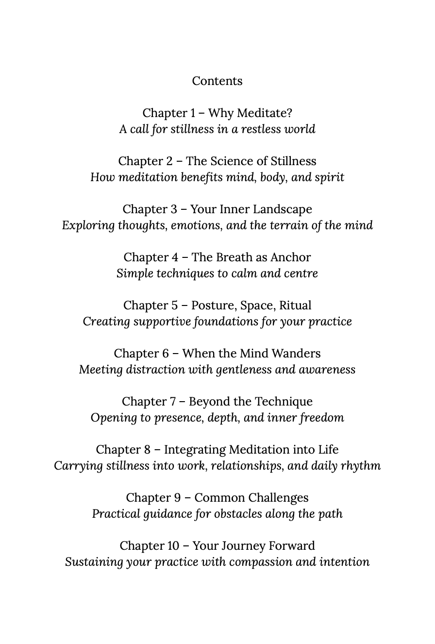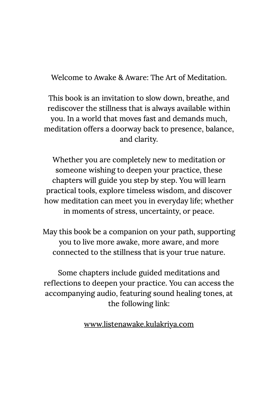 Awake & Aware is a guide to building a meaningful and grounded meditation practice - designed for real people living real lives. With warmth, clarity, and practical wisdom, this book explores the essence of meditation and how to bring stillness, presence, and self-awareness into your daily routine.