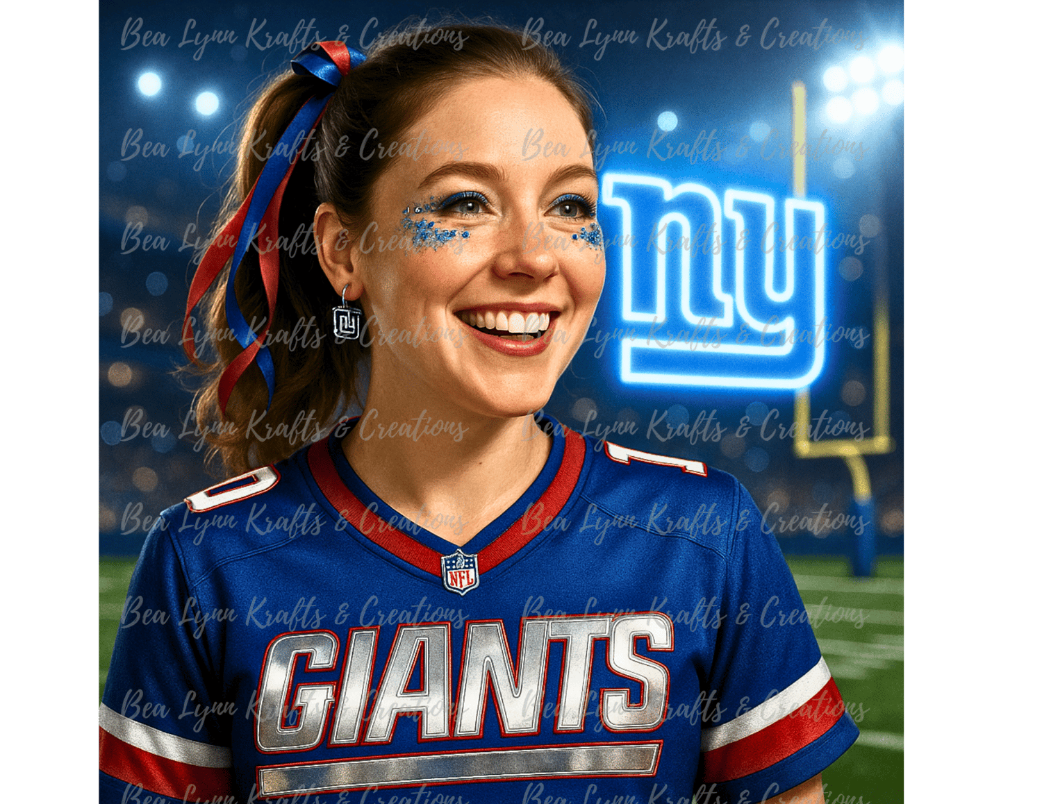 - Features an energetic NY Giants supporter with game-day glitter and vibrant team gear