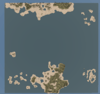 Collection of tropical islands scattered on shallow and open ocean. Dense rainforest, jagged cliffs, tall palms, white sandy beaches and lagoons.