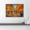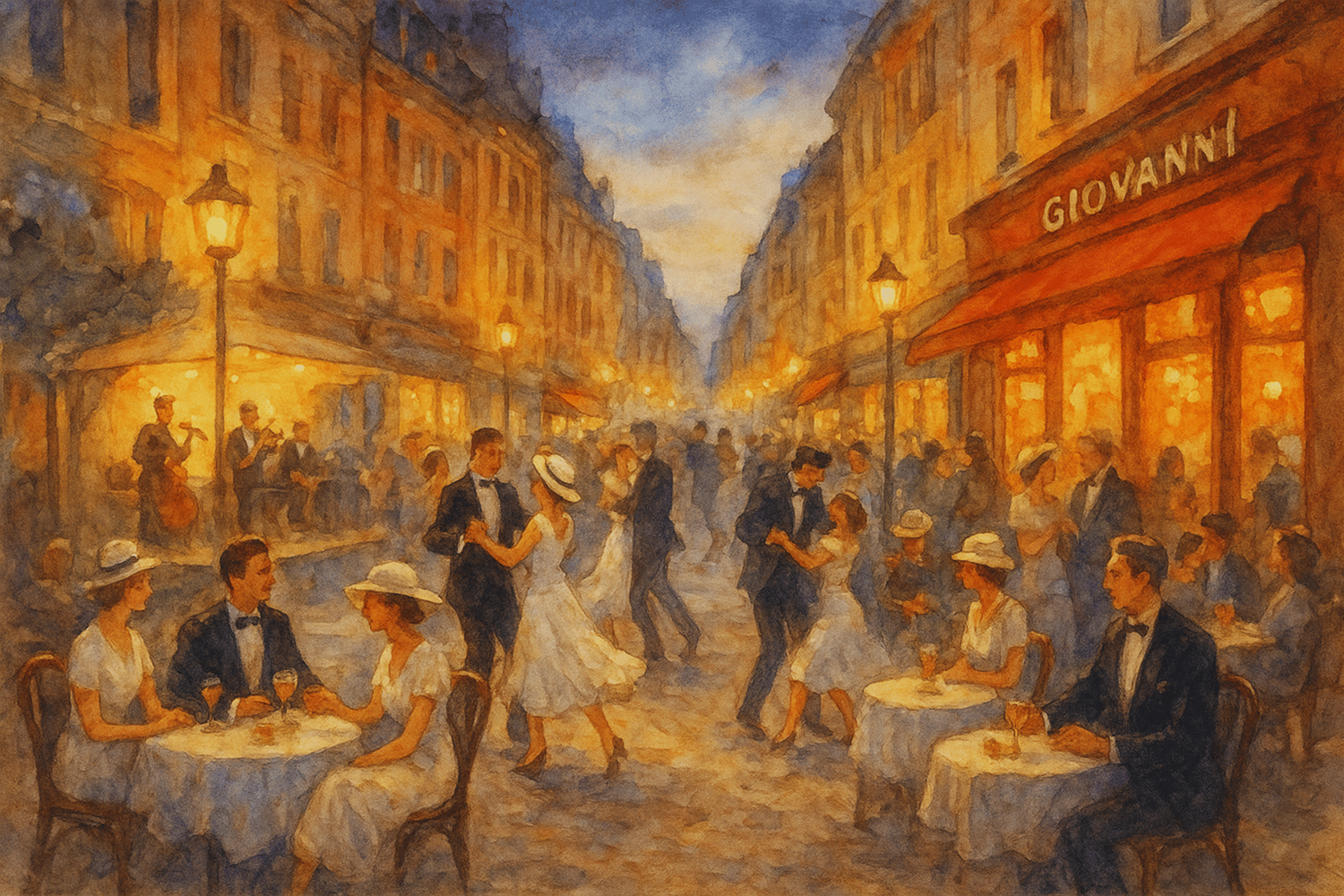 A lively watercolor painting depicting an elegant evening party near Giovanni Restaurant. Wealthy guests dine outdoors, laughing and toasting under the warm glow of lights, while soft music fills the air. The scene beautifully captures the charm of European nightlife, luxury, and celebration.