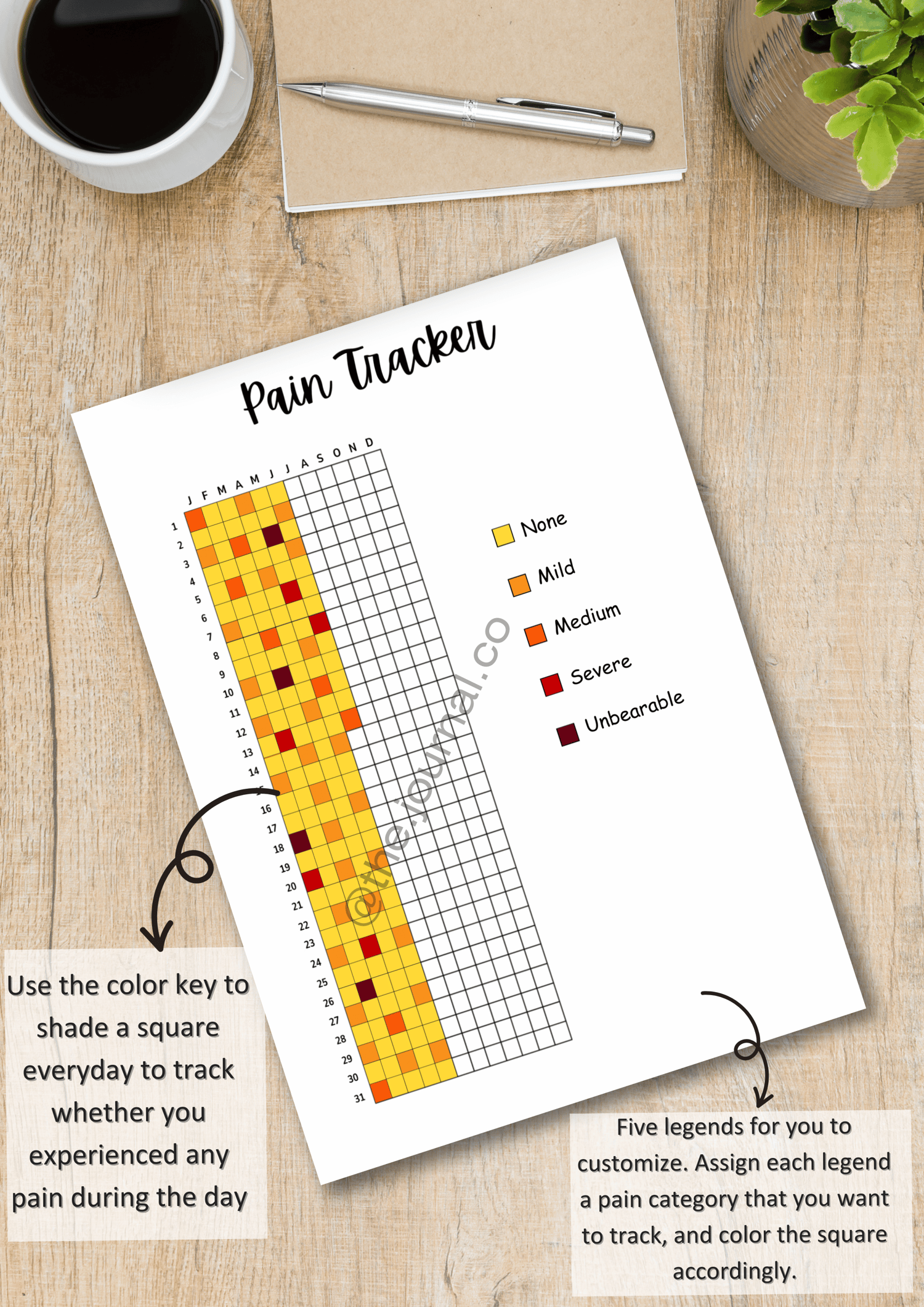 - Features a yearly grid including space for 5 customizable levels for color-coding pain severity
