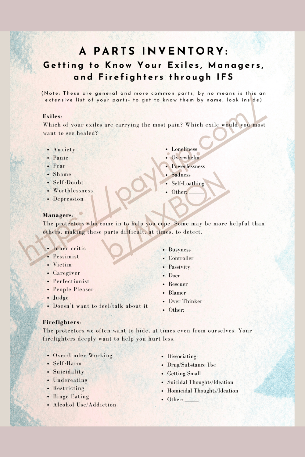 Get to know some common Exiles, Managers, and Firefighters with a parts inventory. Identify your parts, and thread together how these parts may interact with one another.