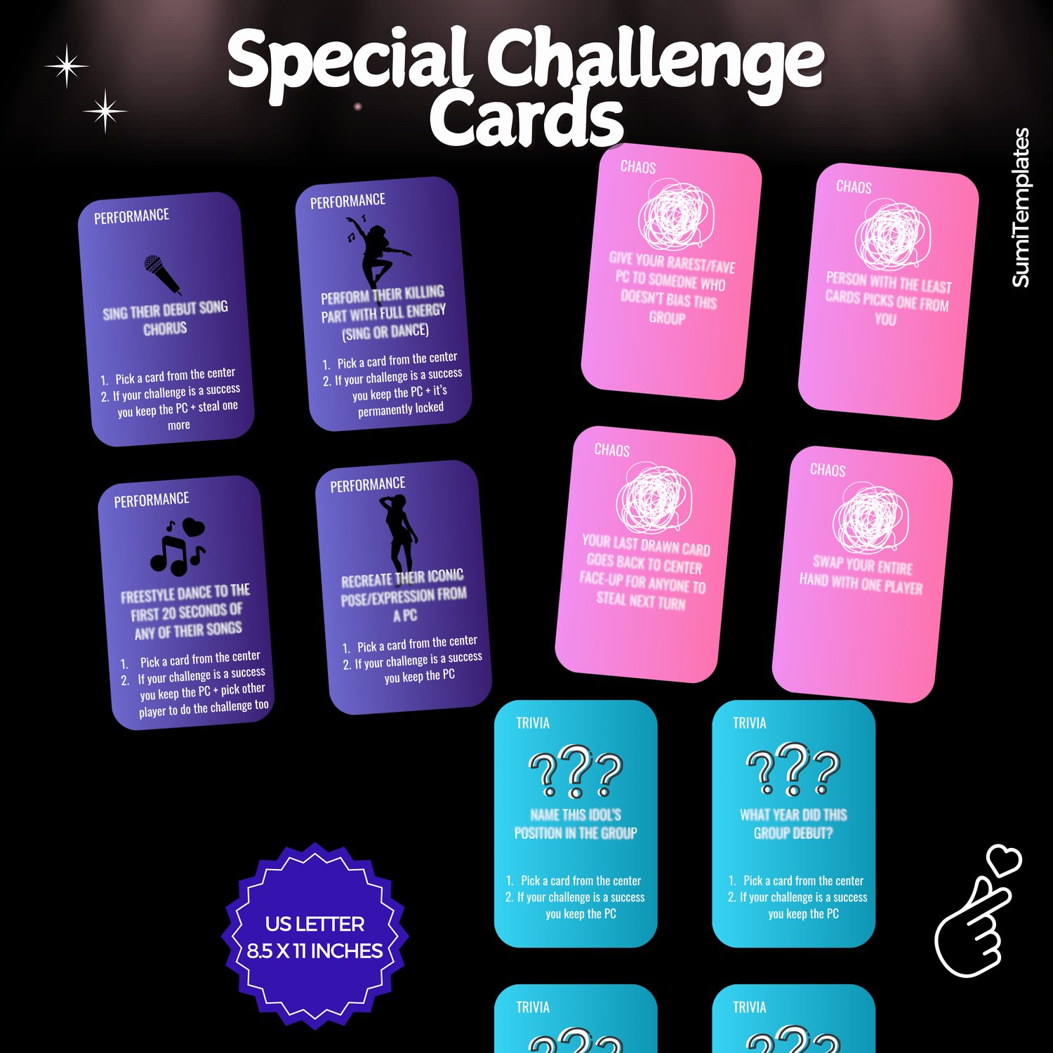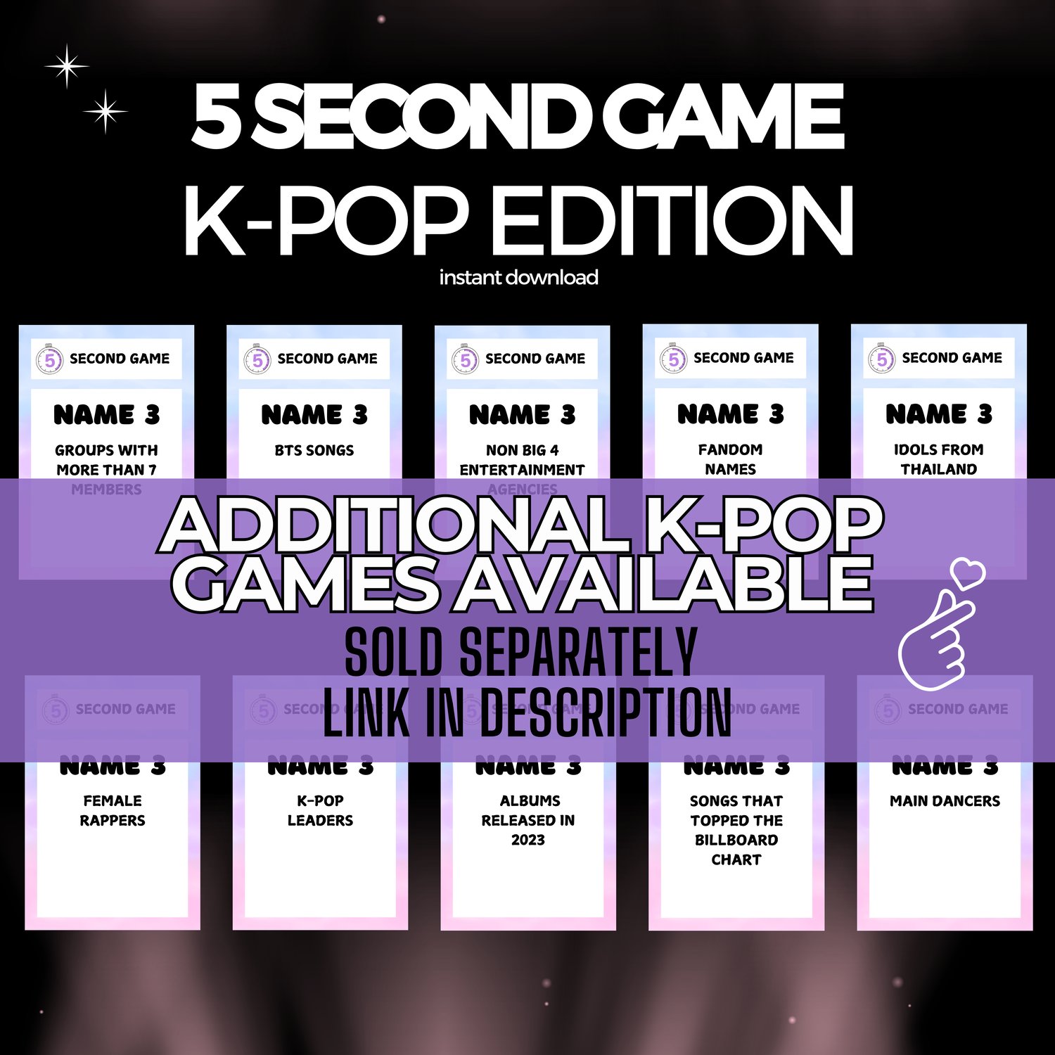 🎉5 Second Game K-Pop Edition: https://sumitemplates.etsy.com/listing/1789193876/k-pop-5-second-game-printable-party-game