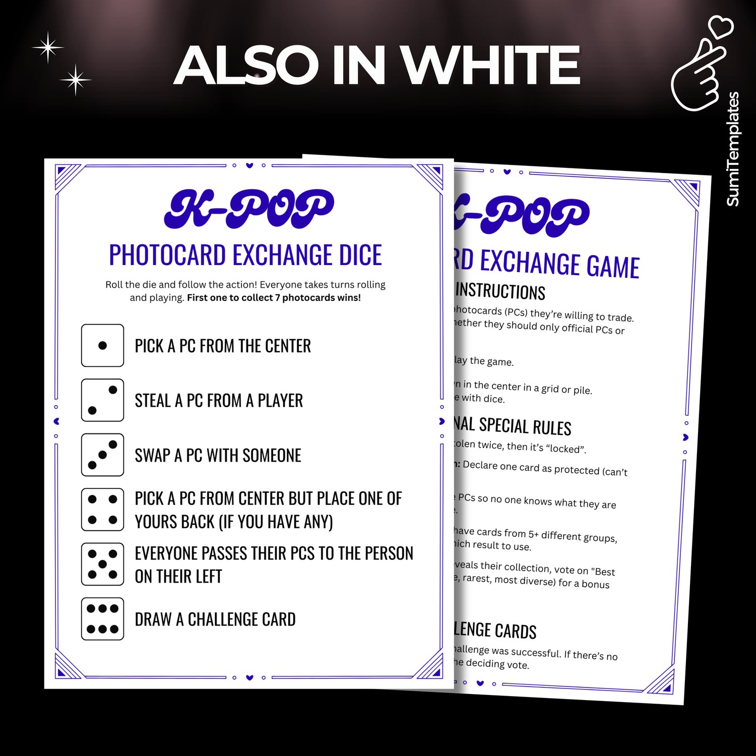 * PDF file with Printable Photocard Exchange Dice Game - in pink and white version and 24 Challenge Cards (to cut out). Jump right in and start playing!
