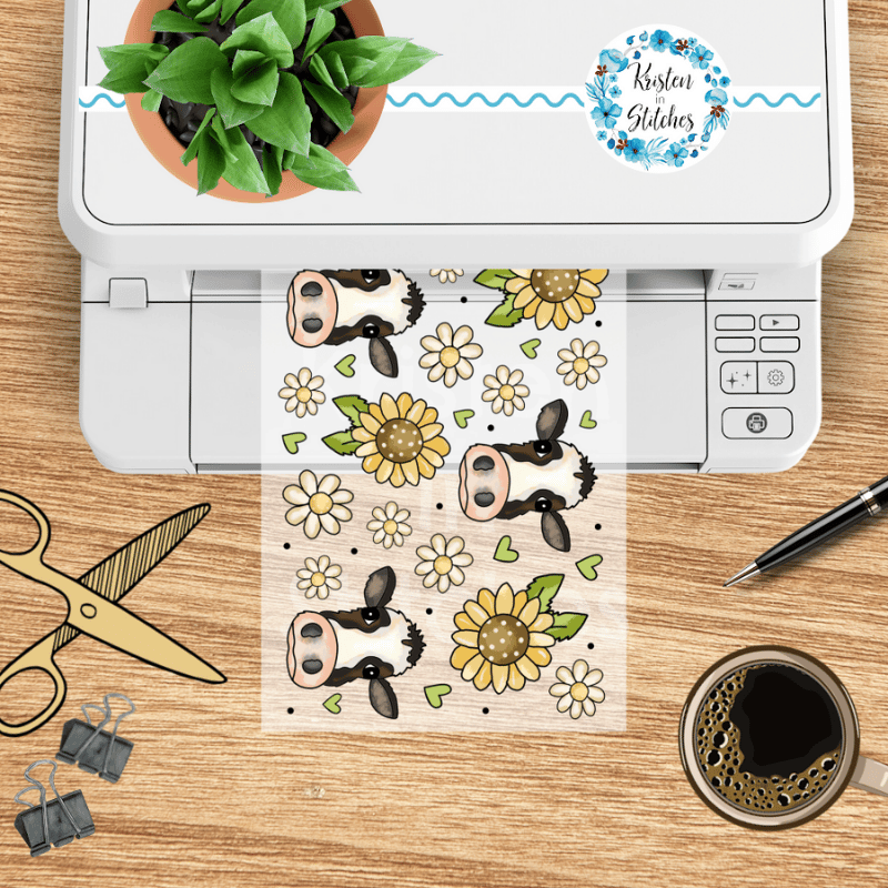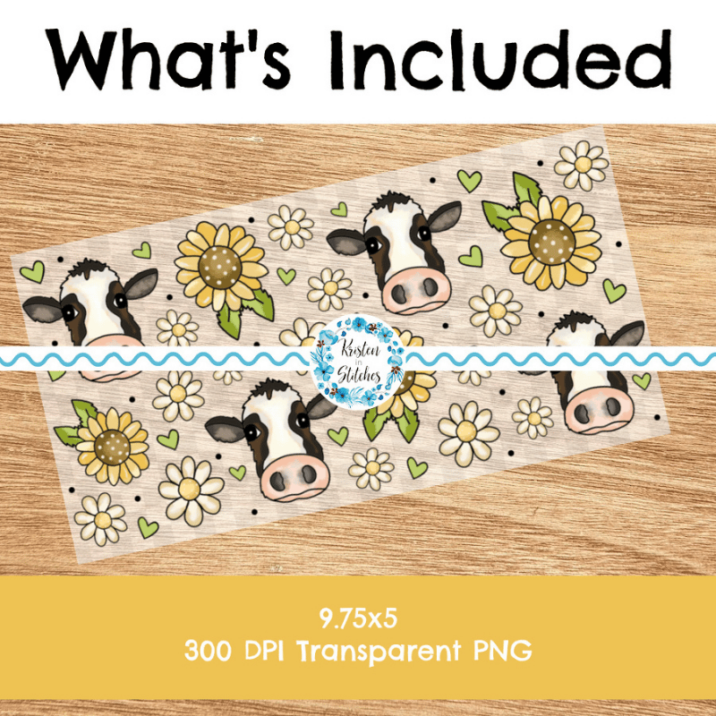 Features cows, yellow sunflowers and white daisy flowers.