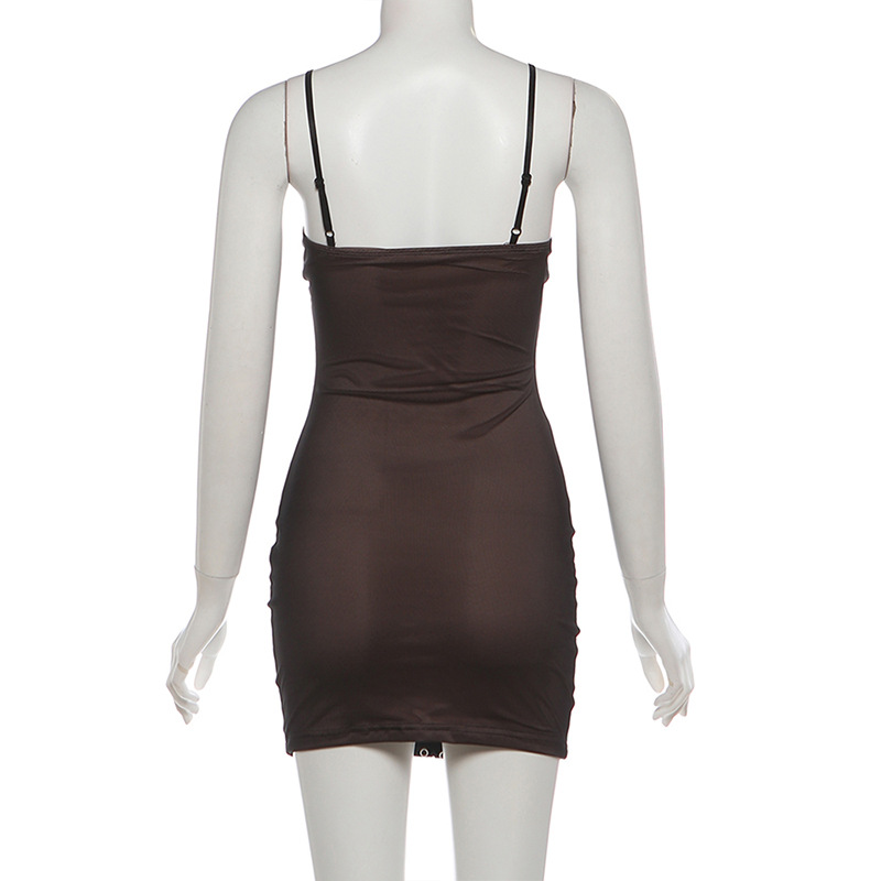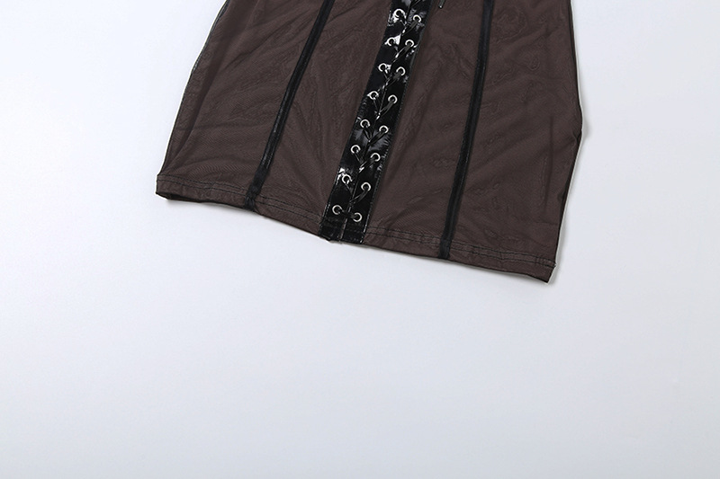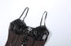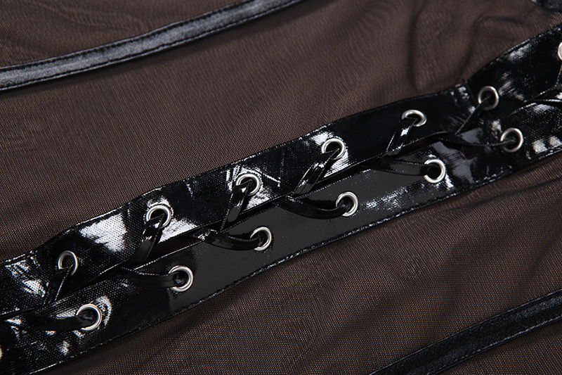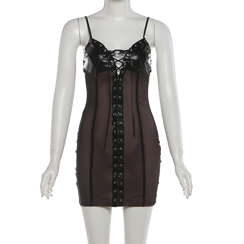 Designer retro punk rock style black PU leather patchwork lace-up mini slim slip dress