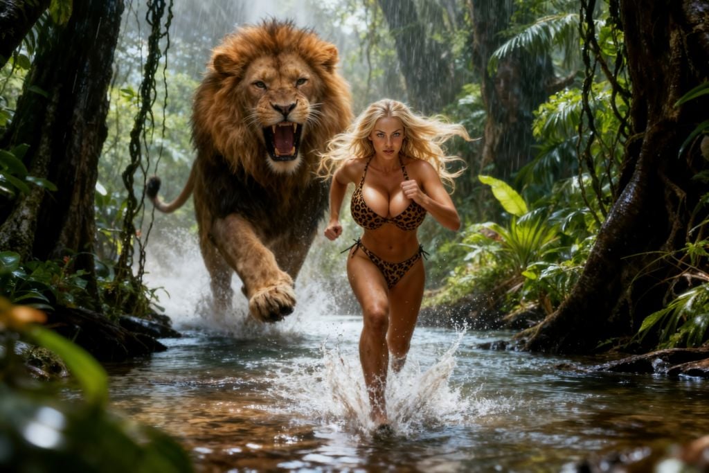 This 15K artwork captures Samantha, Queen of the Jungle at full throttle: fierce, radiant, and unstoppable, racing through the emerald wild with a roaring lion on her heels and danger snapping at the air.