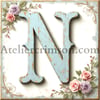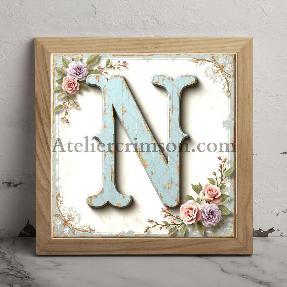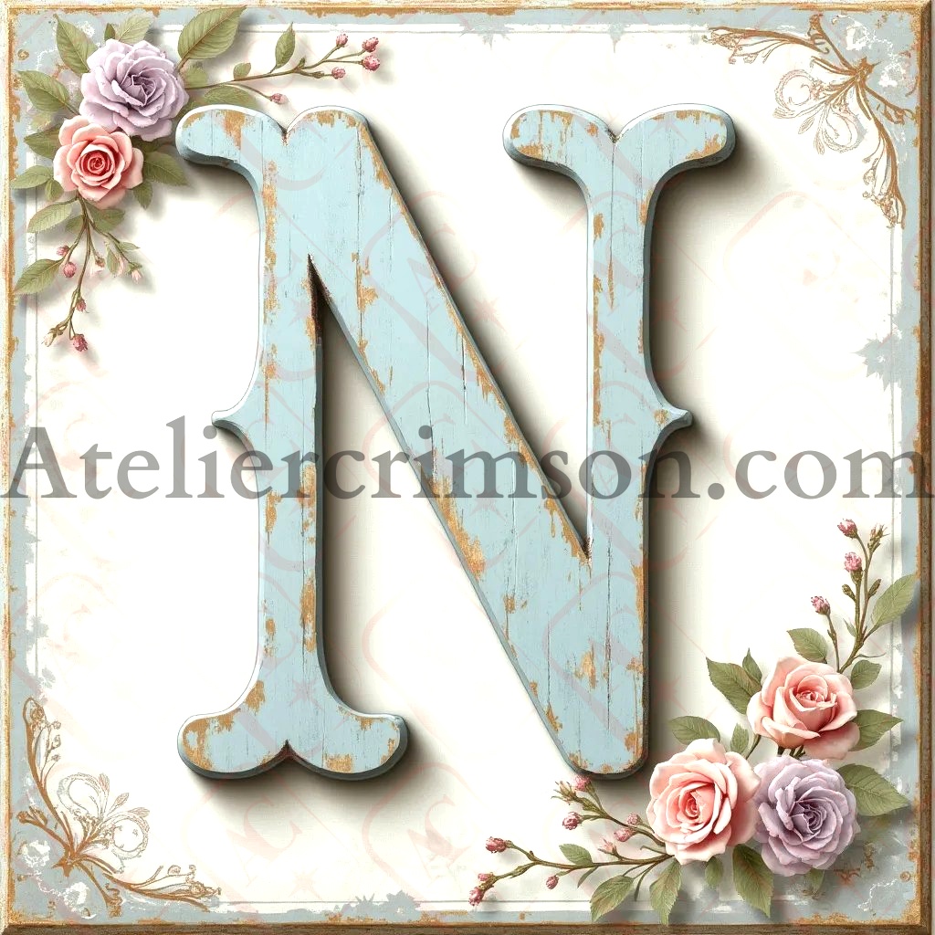 The letter N shabby chic blue a work of art in soft pastel blue. These elegant characters, reminiscent of weathered painted wood, stand out against a delicate off-white background with subtle floral accents. Perfect for vintage-inspired home decor, DIY projects, or creating unique, personalized gifts with a touch of timeless elegance.