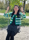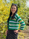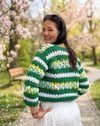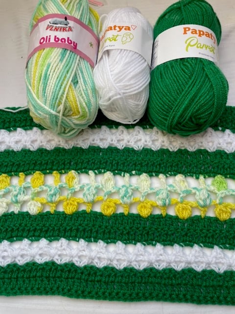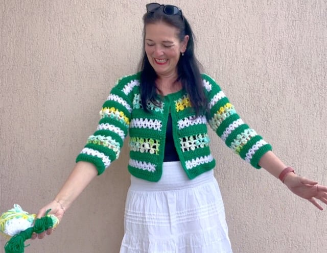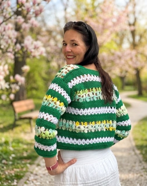 Srdcem tohoto projektu je fascinující kombinace tří typů vzorů a barev, které společně vytvářejí dokonalý celek. Základ tvoří sytě zelené pruhy z dlouhých sloupků, které dávají svetříku jasnou strukturu a hloubku. Ty jsou proloženy jemným bílým mesh vzorem s elegantními kosočtverci, které celému modelu dodávají vzdušnost a křehkost. Pro tyto části jsem zvolila přízi Parrot Papatya, která vyniká svou jemností a krásným vykreslením každého sloupku.