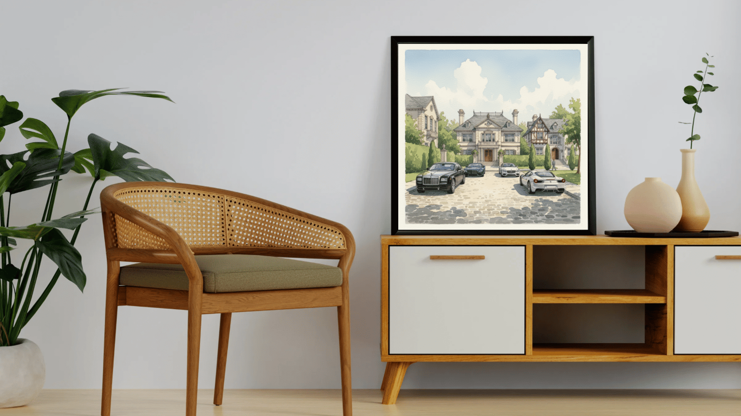 This photo captures a scene of refined luxury and architectural elegance, centered around a grand mansion with classical design elements—symmetrical windows, dormer roofs, and ornate detailing that evoke timeless sophistication. Flanked by similarly upscale homes, including one with Tudor-style features, the estate is surrounded by manicured greenery that enhances its stately presence. In the foreground, five high-end sports and luxury cars—including models resembling a Rolls-Royce, Bugatti, BMW, and Ferrari—are parked on a cobblestone driveway, their polished exteriors gleaming with prestige. The overall composition radiates affluence and aspirational lifestyle, blending opulent living with automotive excellence.