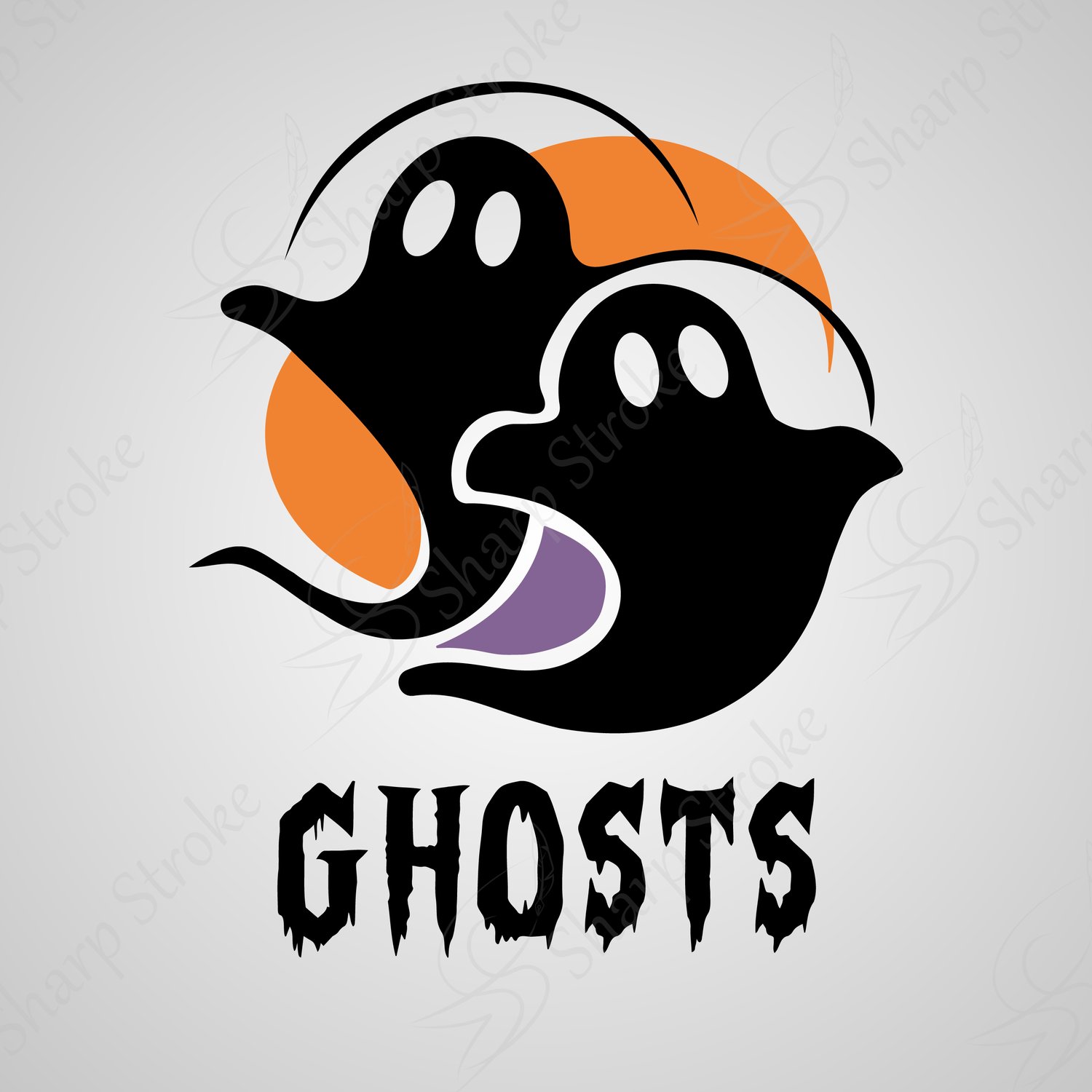 This design features two black ghost silhouettes with vibrant orange and purple accents, striking a scaring pose — a playful yet spooky twist for any project.