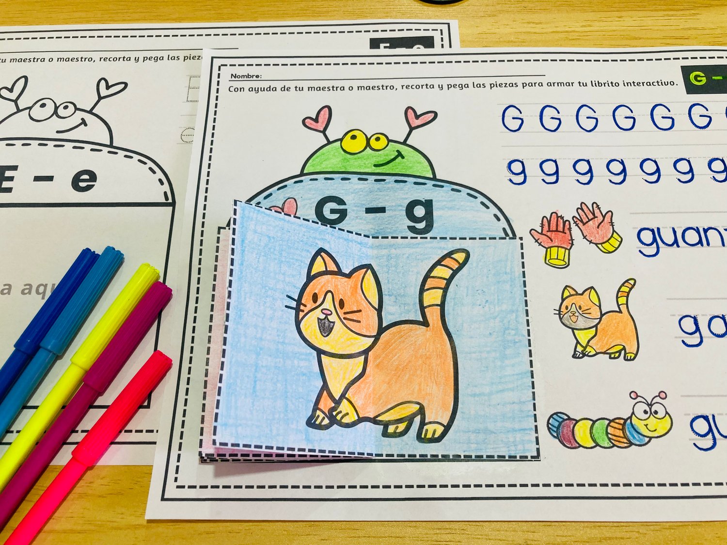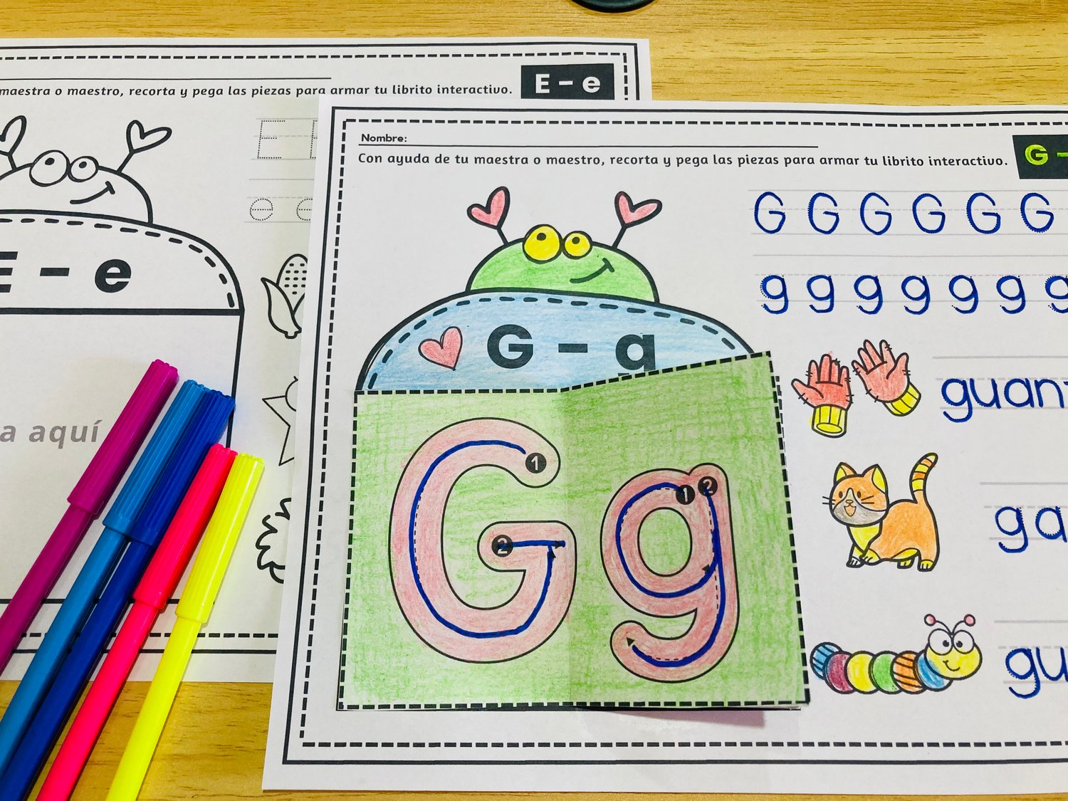 - Mini librito interactivo: Los niños recortan, doblan y pegan pequeñas piezas para armar un librito sobre la letra correspondiente. Esta actividad los motiva a explorar el aprendizaje de manera táctil y visual, reforzando el reconocimiento de las letras de forma multisensorial.