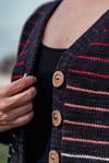 Gauge: 4” (10 cm) square = 20 sts x 30 rows, worked flat in 7/1 striped st st, with larger needles and wet blocked.