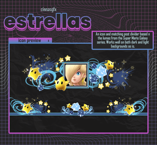 An icon template & post divider based on the lumas from the Super Mario Galaxy series, as requested by shibemuses on tumblr. There's no blockquotes, but it should be wide enough to cover the post width. The image used in the preview is not included with the psd file. Easy to edit if you're familiar with the following: layer styles and layer masks.
