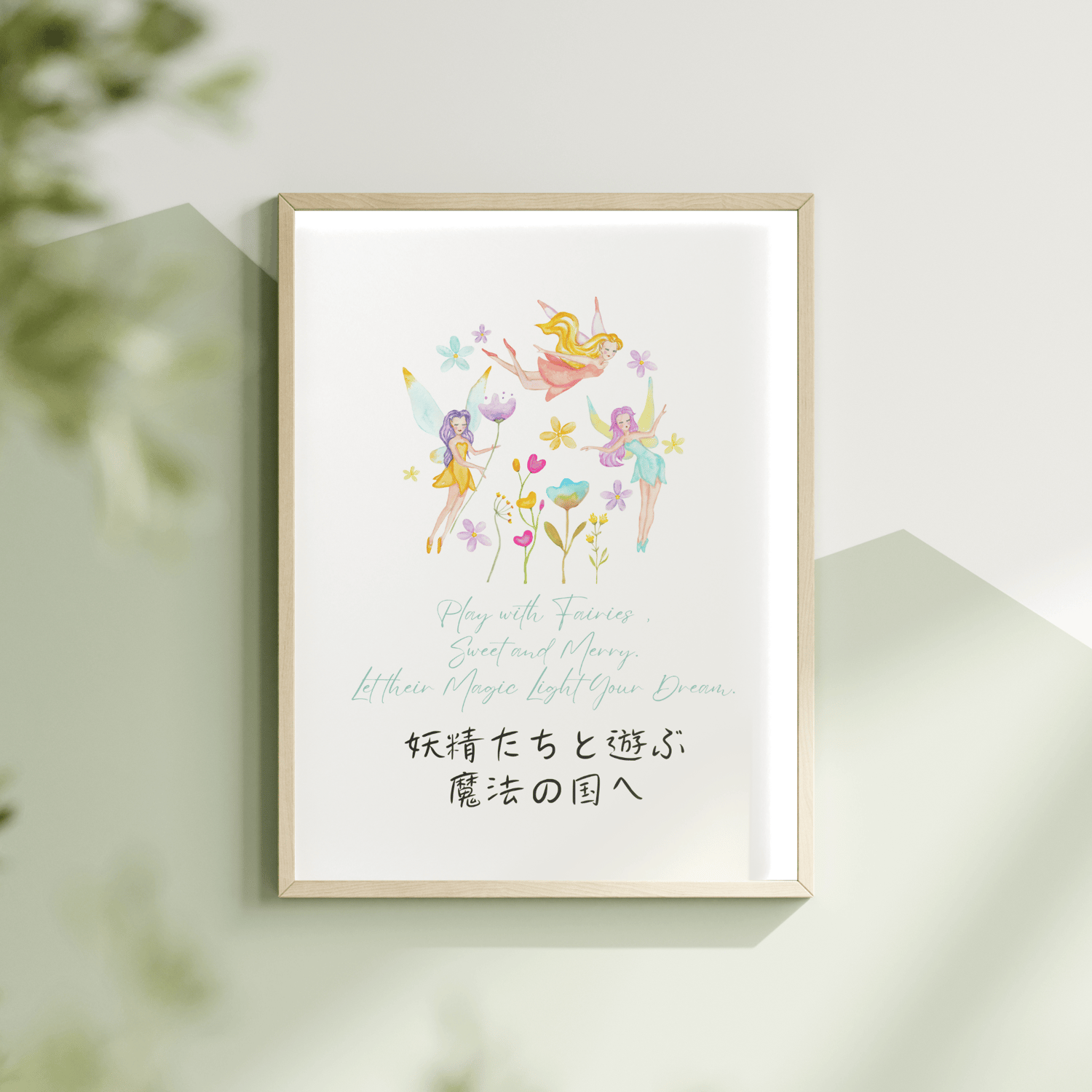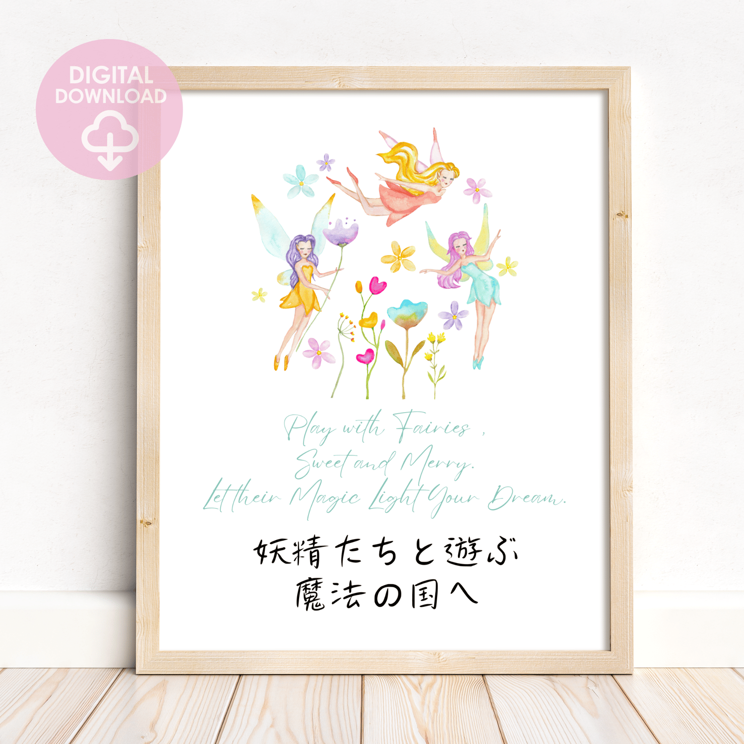 Brighten up your little girl's room with this enchanting fairy garden wall art. This watercolor artwork features a delightful scene of fairies and flowers, accompanied by an inspirational quote in both English and Japanese. The design is printed on high-quality paper, ensuring vibrant colors and durability. Perfect for adding a touch of magic to any space, this printable wall art will captivate the hearts of both children and adults.