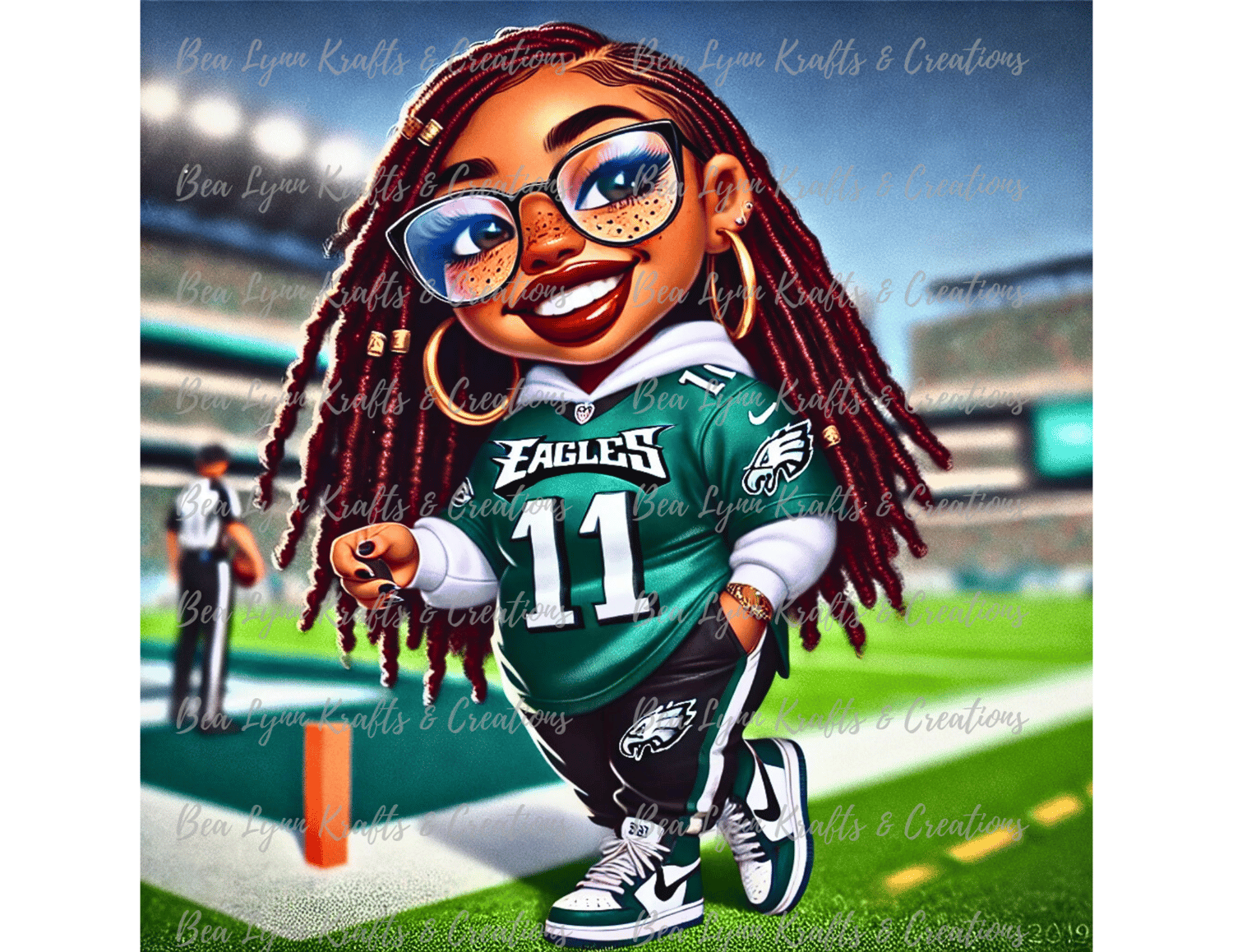 Get ready to show your team spirit with this super hyped sports fan digital PNG! This vibrant design features a stylish, short, curvy, 40-year-old character bursting with energy and passion. Dressed in a bold sports jersey, accessorized with trendy sneakers, hoop earrings, and her signature burgundy dreadlocks, this character embodies the ultimate game-day enthusiasm. Whether you're creating fan merchandise, personalized gifts, or event materials, this image is sure to captivate attention and exude high-energy vibes.