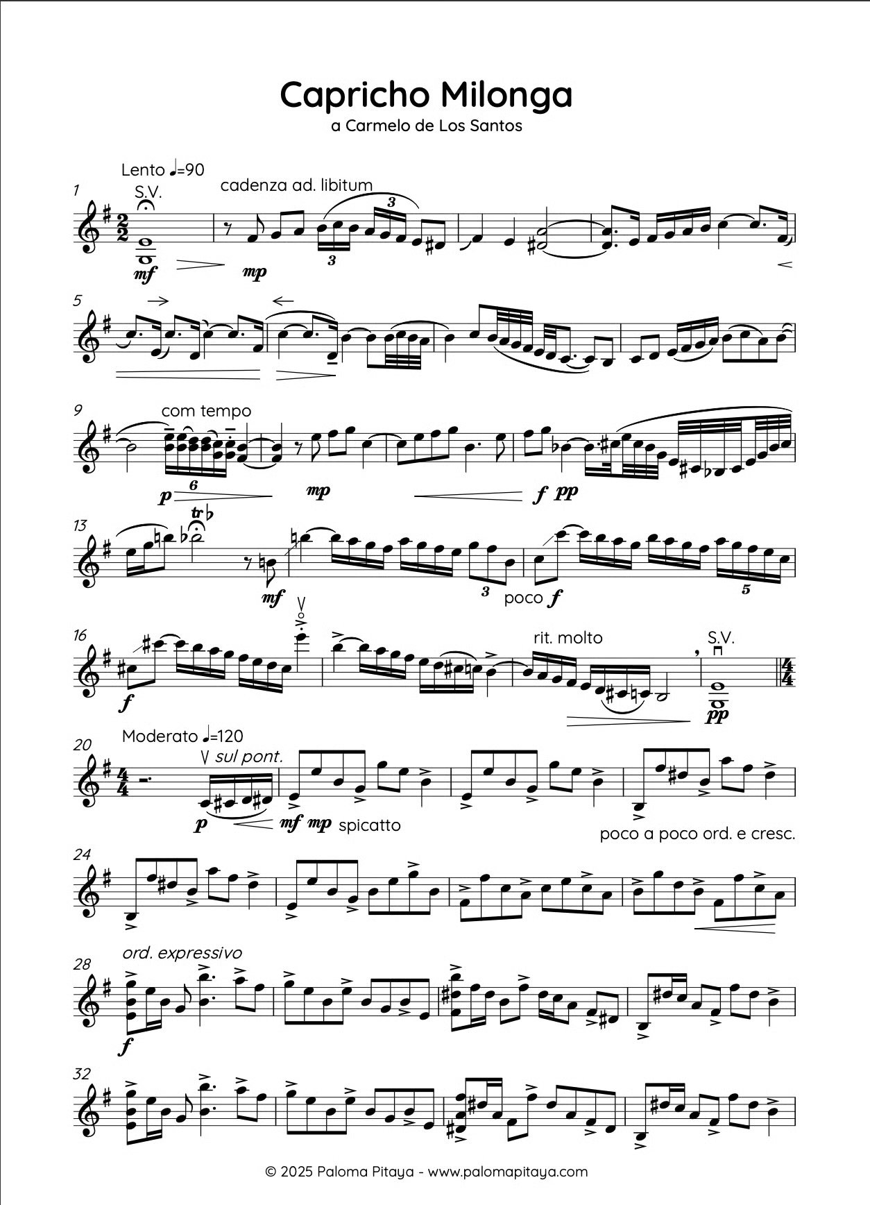 Originalmente escrito para violino solo, Capricho Milonga tem ligação com o sul do Brasil e Argentina e, como nasci no Rio Grande do Sul, me conecta diretamente com as minhas raizes. A peça tem uma atmosfera trágica e desesperançosa, sua introdução foi escrita a partir de um improviso ao violino que fiz no dia que fiquei sabendo das enchentes no meu estado.
